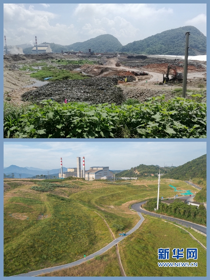 (拼版照片)红庙岭一期垃圾卫生填埋场的生态重建:上图是2018年9月2日拍摄到的生态修复施工现场,杂草凌乱。新华网发(许流钦 摄);下图是2020年7月23日无人机拍摄到生态修复后的生态公园一隅,满眼皆绿。新华网 肖和勇