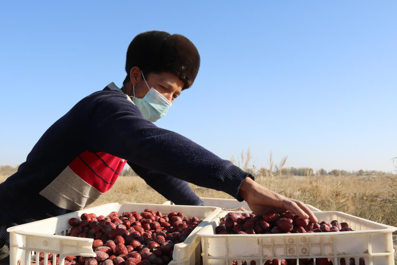 图为;11月8日,季节性务工人员在和田县吾宗肖乡汉族队村装箱红枣。 通讯员 包剑摄