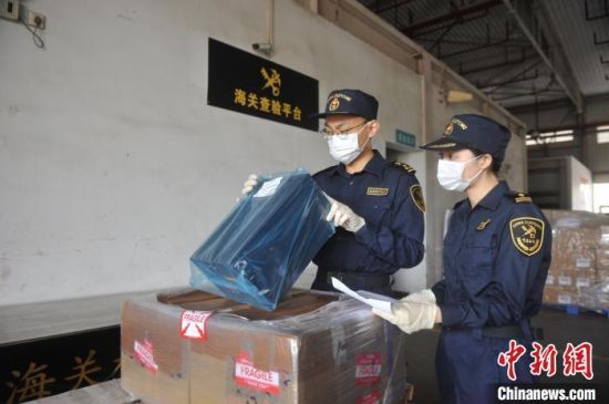 海口海关所属海口美兰机场海关关员在美兰机场货运监管场所开展首票“零关税”原辅料货物监管工作 。 王基辉 摄