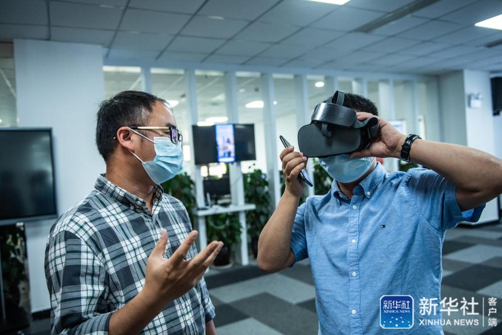 参观者在工作人员的介绍下使用VR设备体验“一码游贵州”全域智慧旅游平台(2020年6月14日摄)。新华社记者 陶亮 摄