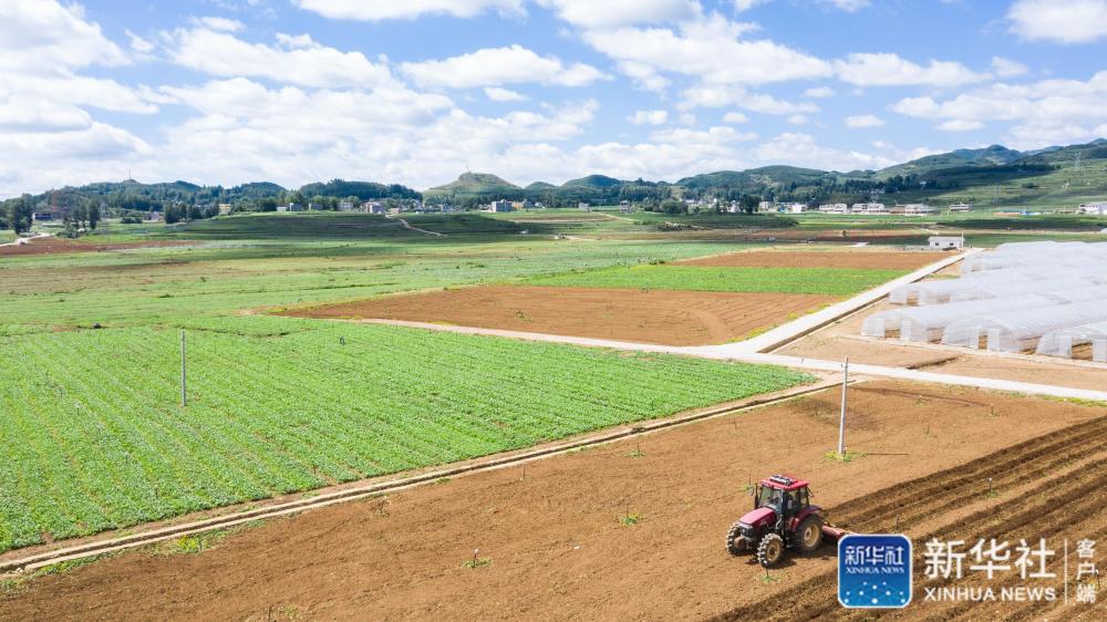 毕节市威宁彝族回族苗族自治县双龙镇水潮村村民驾驶农机在田间劳作(2019年6月21日摄,无人机照片)。新华社记者 陶亮 摄