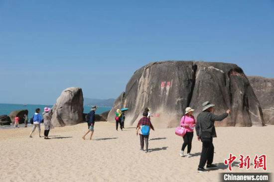 游客在天涯海角景区知名景点天涯石留影。 天涯海角景区供图