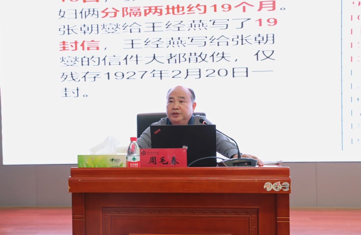 周毛春以他的外公外婆张朝燮、王经燕的革命事迹为切入点展开讲述,带领大家重温了两位老人的革命轨迹,讲述了革命先辈们用沸腾的热血、不屈的意志、无畏的精神演绎的经典红色革命故事,诠释了他们勇于牺牲的奋斗精神和绝对忠诚的革命信念。周毛春还结合党史对张朝燮、王经燕的“两地书”进行了深刻解读,那十九封书信、厚厚的信笺,见证了一对远隔万里的革命伴侣之间的坚贞不渝、共同成长,他们为着共同的理想和初心不惜抛头颅、洒热血,他们的红色爱情、坚如磐石的信念,不仅展现了革命先辈“革命理想高于天”的崇高追求,更让大家深切感悟了共产党人的初心和使命。