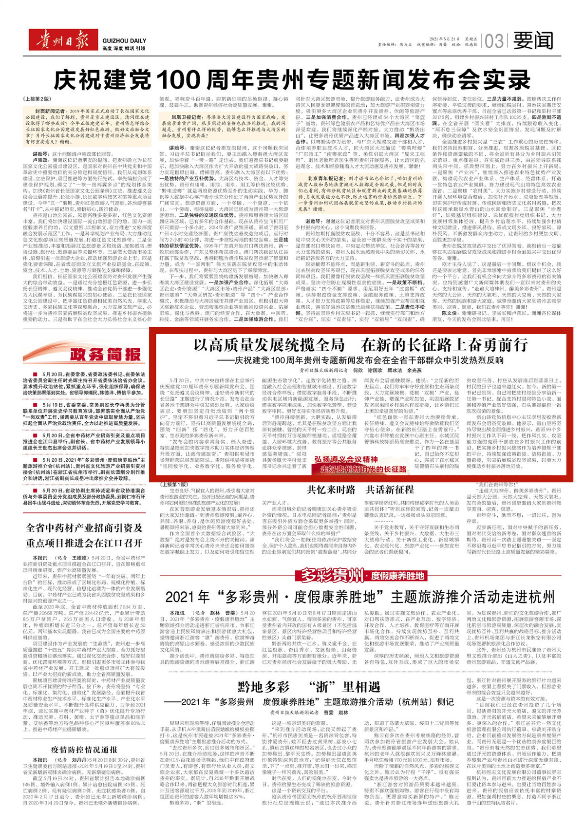 5月20日,中共中央宣传部在北京举行庆祝建党100周年贵州专题新闻发布会,围绕“弘扬遵义会议精神,走好贵州新时代的长征路”主题进行了情况介绍。发布会在全省各地干部群众中引发强烈反响,大家纷纷表示,要更加坚定自觉地做到“两个维护”,坚定不移沿着习近平总书记指引的方向奋力前行,坚持以高质量发展统揽全局,围绕“四新”抓“四化”,努力开创百姓富、生态美的多彩贵州新未来。