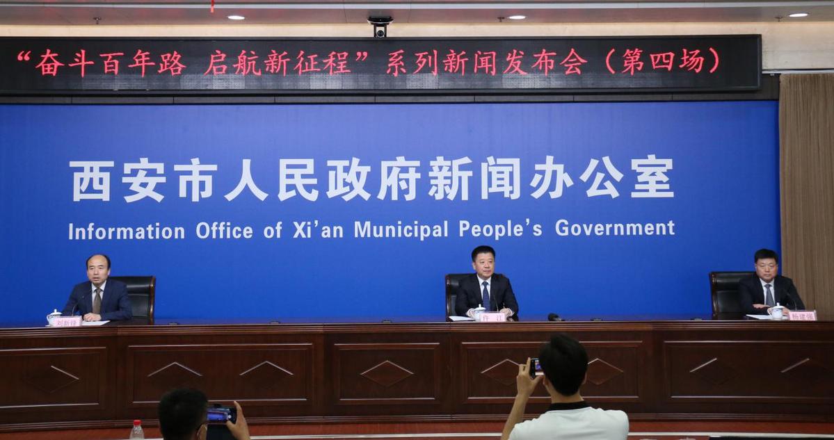 6月1日,西安市人民政府新闻办公室召开“奋斗百年路 启航新征程”发布会,新城区委书记仵江;未央区委书记杨建强出席,西安市委宣传部副部长刘新锋主持发布会。