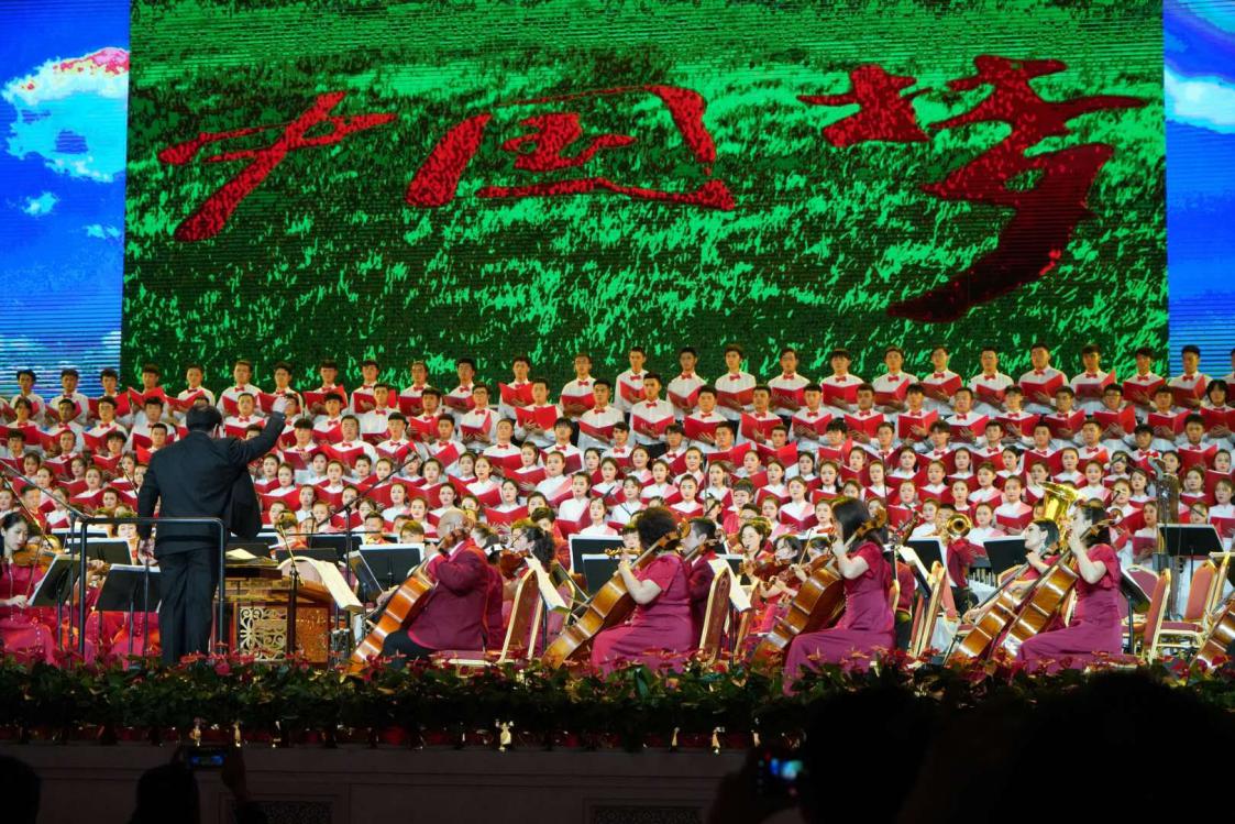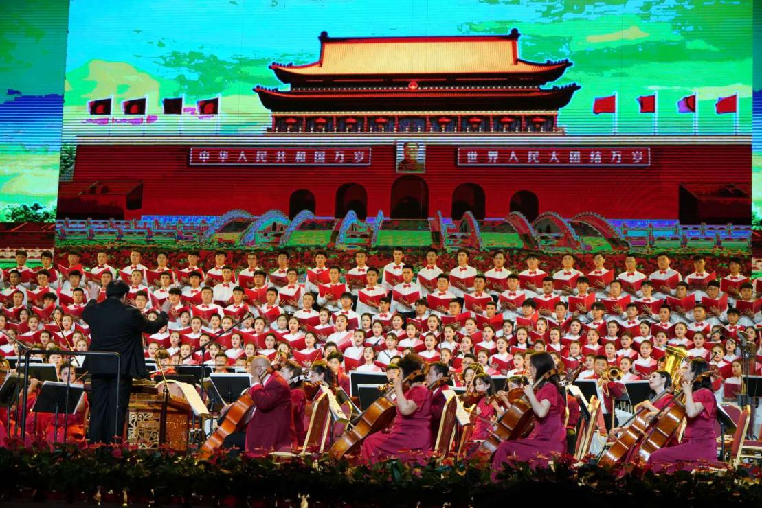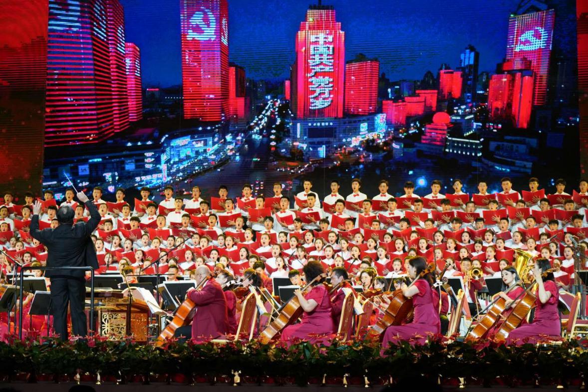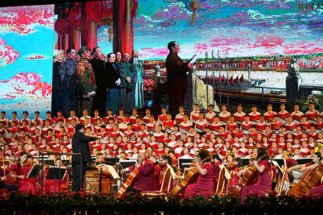“东方红 太阳升 中国出了个毛泽东......”在一轮红日跳跃而出的背景下,雄厚坚定有力的歌声从252位青年大学生的心中喷涌而出,熟悉的旋律、朴实的歌词一下子把全场观众带回到了人民群众对毛泽东主席深情回忆中;带回到了毛泽东主席站在天安门城楼上,向全世界宣告“中华人民共和国中央人民政府成立了”的庄严时刻情景中;带回到了中国第一颗人造卫星“东方红一号”把《东方红》乐曲通过广播传遍了全世界的光荣岁月中!由此拉开了自治区庆祝中国共产党成立100周年“天山儿女心向党”交响音乐会的序幕。