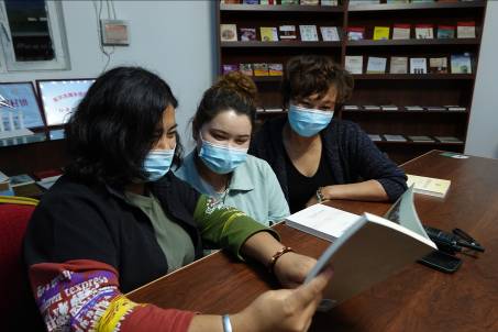 和静县克尔古提乡浩尔哈特村新入职的干部才排力、古再努尔 肉孜、易茹(从左至右)来到该村图书馆,学习交流,为第二天入户宣讲做准备。邹焰忠 摄