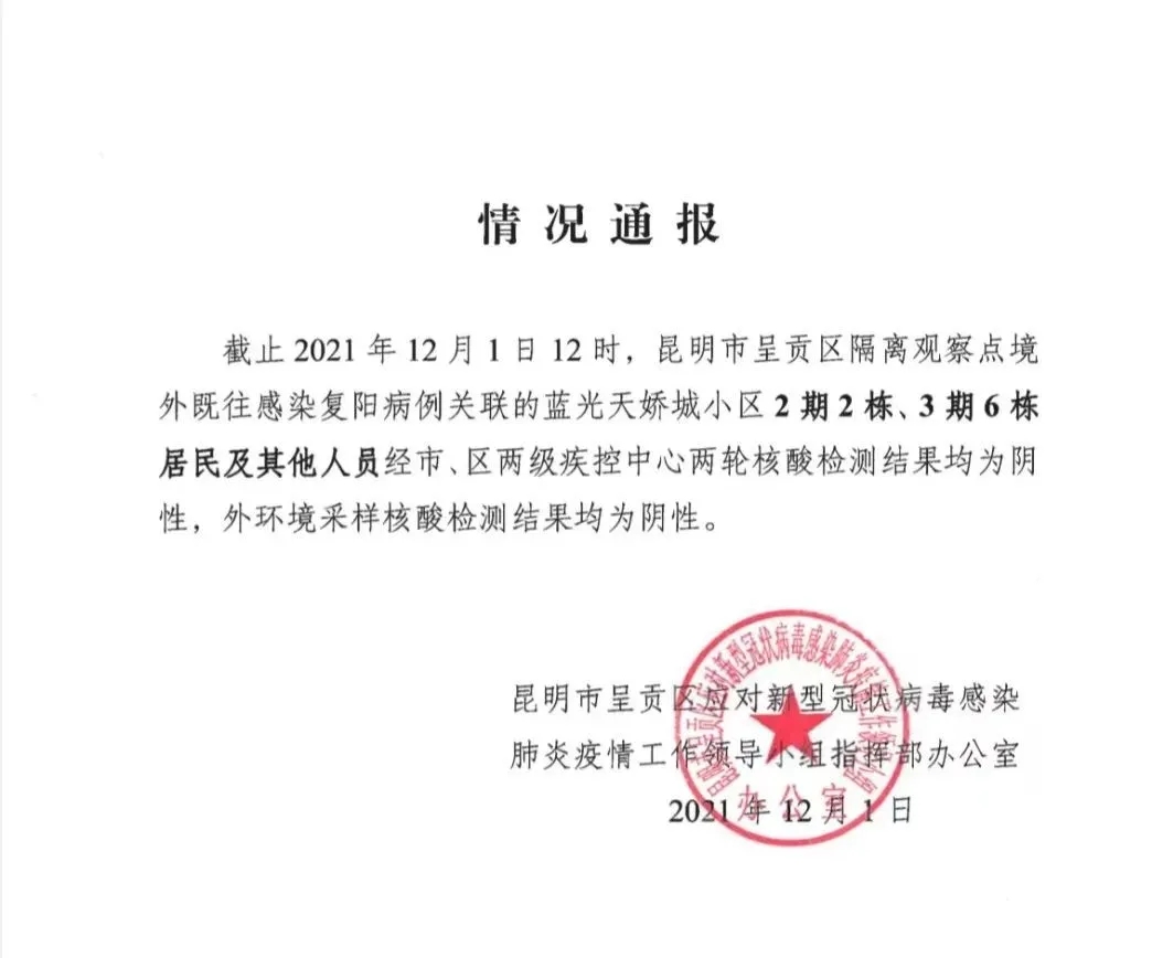 据@呈贡发布 消息,截至2021年12月1日12时,昆明市呈贡区隔离观察点境外既往感染复阳病例关联的蓝光天娇城小区2期2栋、3期6栋居民及其他人员经市、区两级疾控中心两轮核酸检测结果均为阴性,外环境采样核酸检测结果均为阴性。