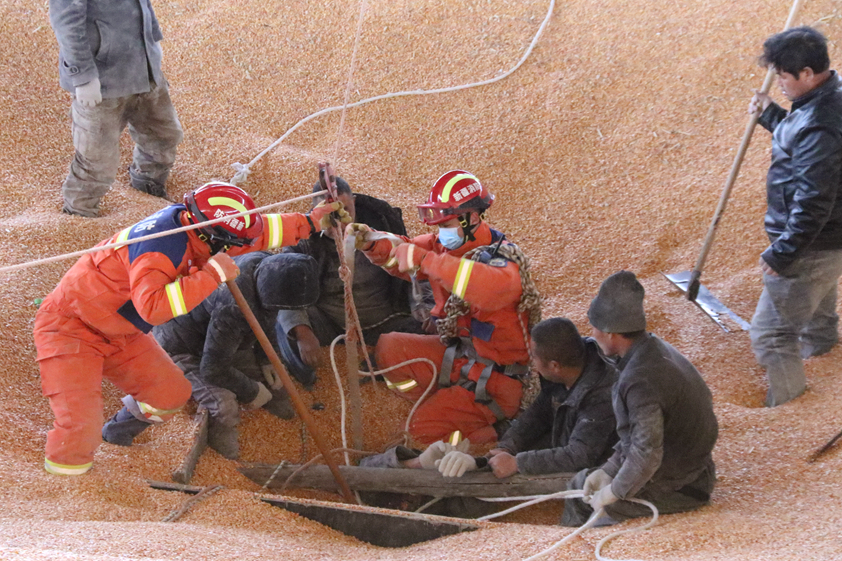 救援人员到达现场后侦察发现,整个粮仓大约有20米高,内装有玉米4000多吨,被困工人全身被淹没在玉米碎中,仅剩颈部以上露在外面,救援难度较大,所幸被困人员意识清醒,能够主动配合救援。指挥员在确保粮库环境安全后,立即下达救援命令,6名消防员从粮库楼梯旁边的一处狭窄的换气窗先后进入,利用铁锹、双手扒开玉米碎,抓住被困者计划齐力拉出,但由于被困者被包裹得严严实实,无论消防员怎么用力,他还是丝毫动弹不得。
