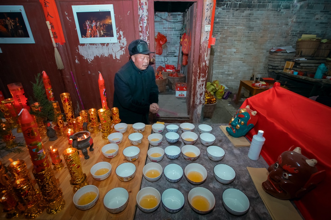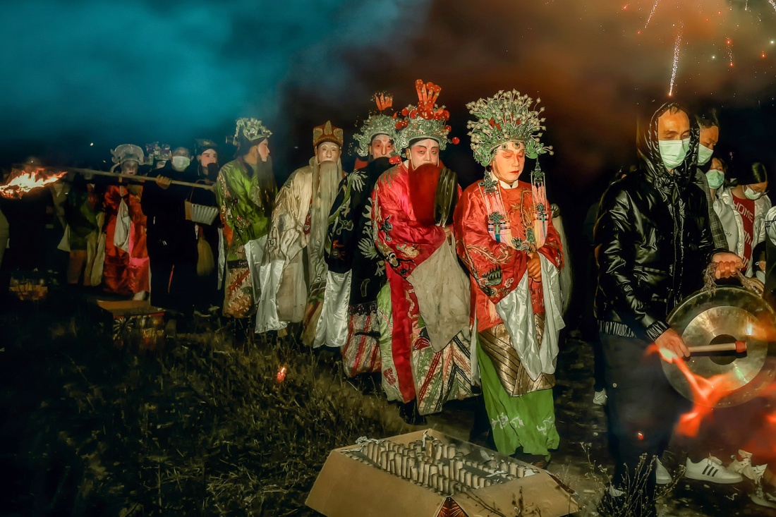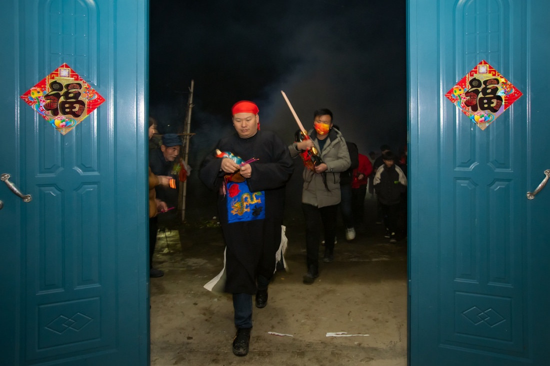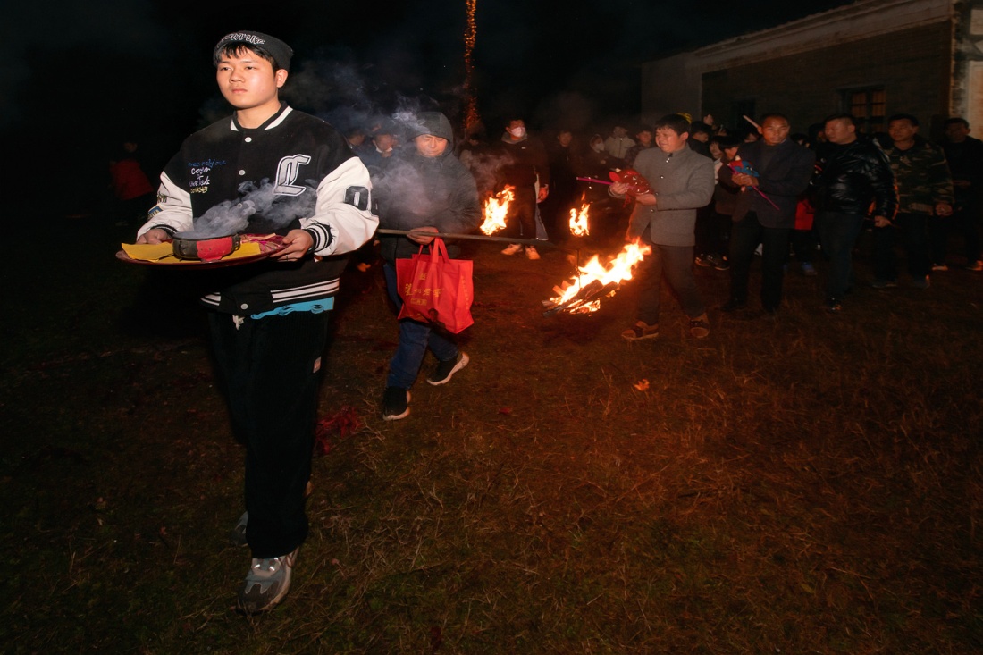 沿途,村民以烟花、香烛、纸钱、鞭炮进行接送,此时田东村的街巷小道便游动出了长长的火龙,打着火把穿过桔林、迎着烛光踩过田埂蜿蜒着向傩神殿进发,最后在傩神殿举行圆傩仪式,这种延续了几百年的古傩规从无变更,也正因为如此才形成了田东村独具特色的乡傩风情。(谢卫民摄影)