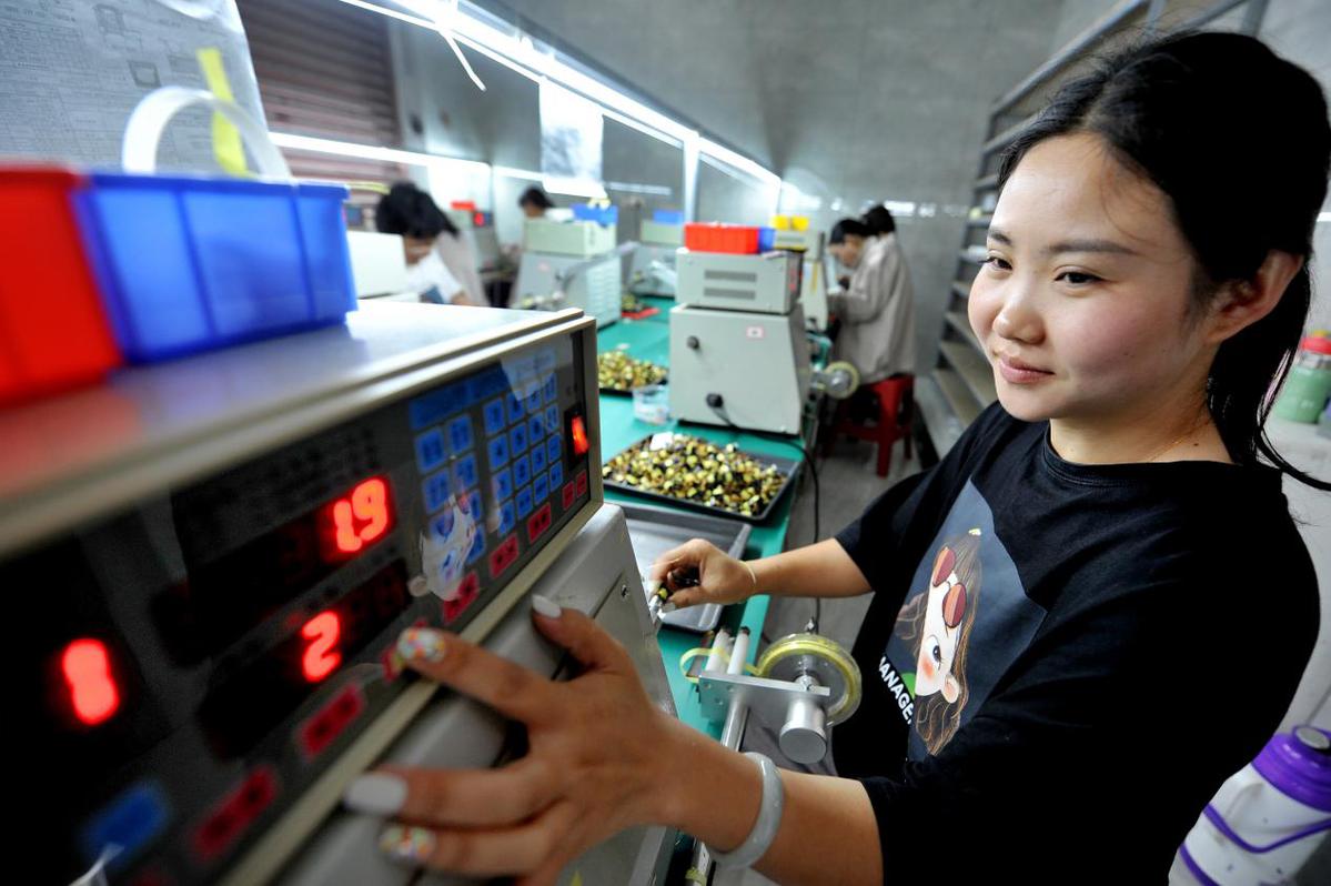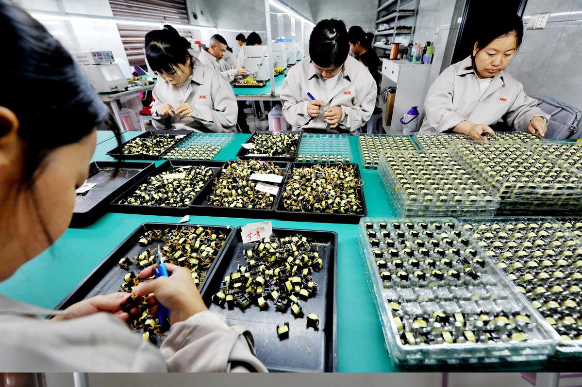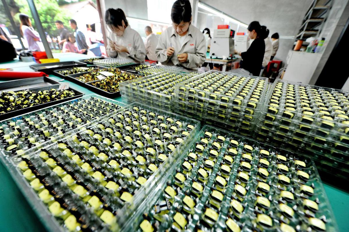 2022年6月14日,在江西省上饶市广丰区东阳乡龙溪村与上饶市方舟电子有限公司的村企共建车间,几名农民女工正在对加工好的电子元件订单产品进行质量检测。