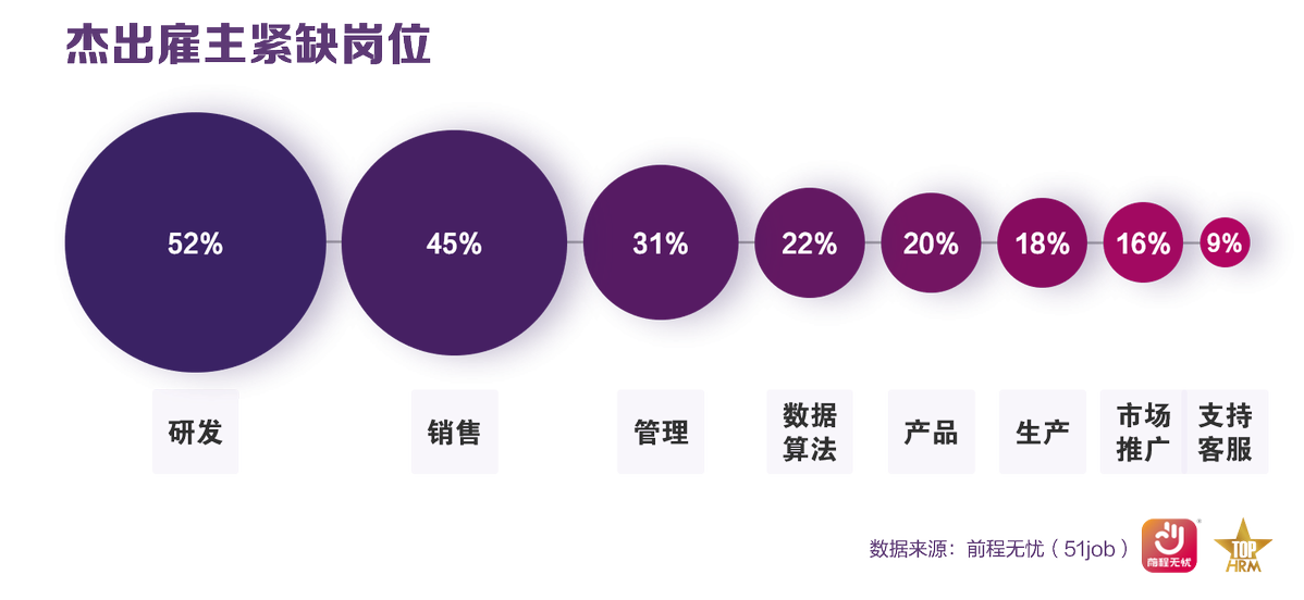 从职能上来看,研发类、销售类依然是企业最紧缺的岗位。数据/算法类岗位的市场需求量开始减少,而管理类人才开始成为市场新的缺口,客服、财务、人事和行政等后台支持类岗位持续饱和。杰出雇主们不断尝试新的招聘工具,70%的企业会常态化的使用视频面试,超过五成企业选择测评工具和直播招聘。