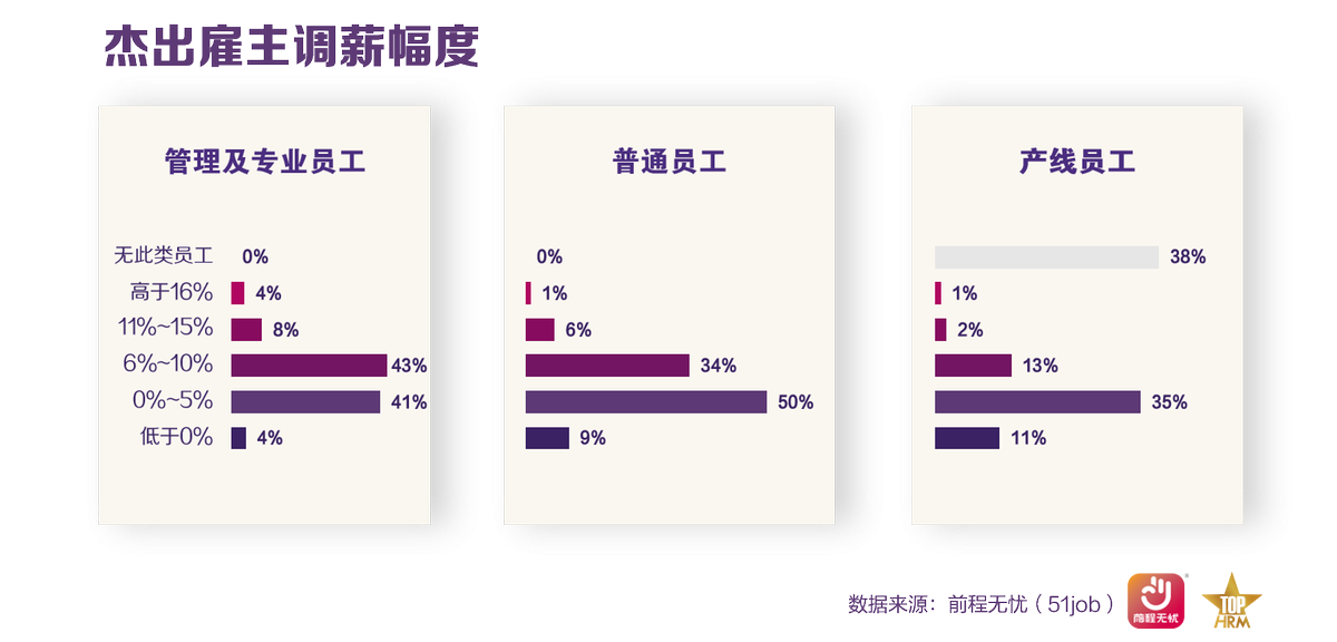 有92%的杰出雇主给员工加薪,较去年上升30%。从涨薪幅度看,管理及专业员工的涨幅大于普通员工和产线员工。从行业来看,半导体通信、科技行业和能源化工行业对员工薪资的涨幅较大。从企业性质看,非本土企业里给员工涨薪的企业占比更高,且涨薪幅度也高于本土企业。