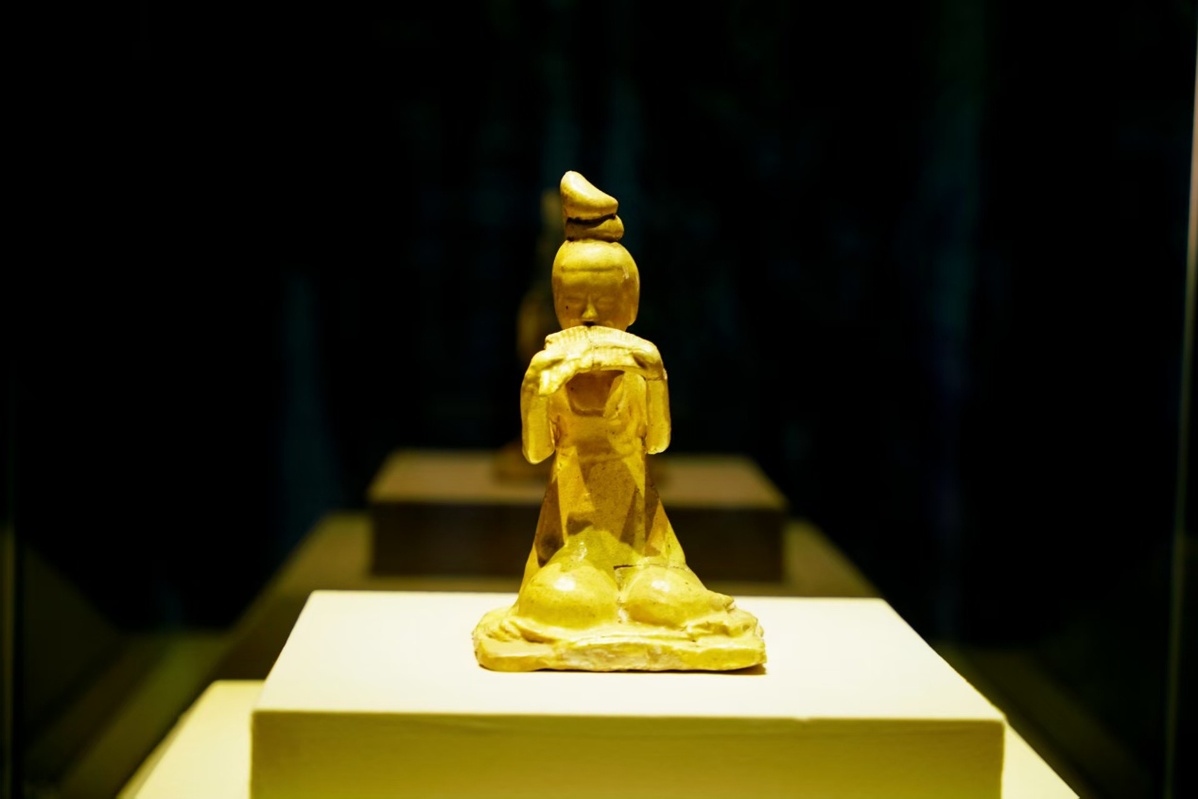 文物与数字影像的互文更添沉浸感。隋至初唐的黄釉吹排箫女俑仪态柔美,仿佛要奏响《渭城曲》;唐代茶酒器泛着温润光泽,文房陈设静静陈列,让人遥想诗人伏案挥毫的瞬间。“乐——清音回响”展区内,《阳关三叠》旋律随光影流动,“劝君更尽一杯酒”的别绪弥漫空间;《鸟鸣涧》曲调与虚拟山鸟交织,幽谷意境触手可及。“过去在书里读诗,现在走进了诗里。”游客的感叹道出心声。