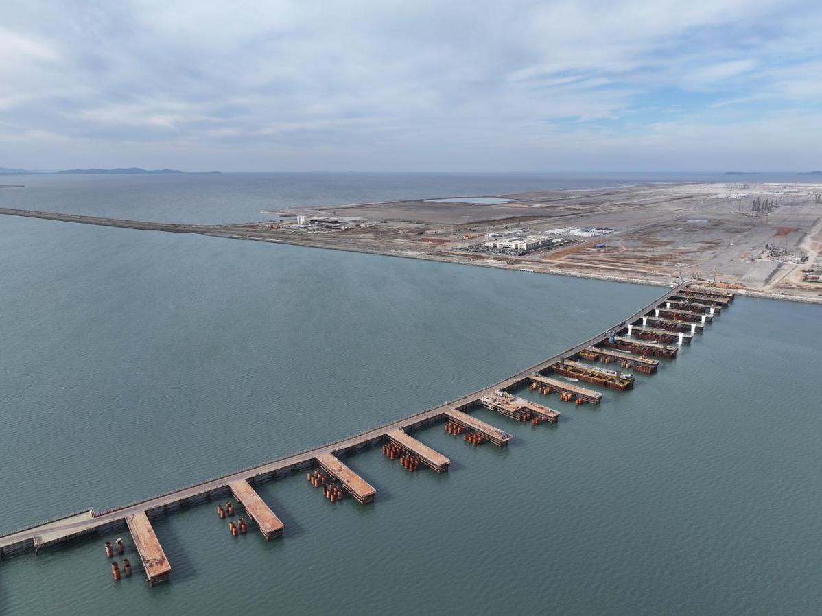 大连新机场中线主通道跨海段工程由中交二航局负责牵头施工,建成后将成为完善大连金州湾国际机场集疏运系统、实现机场与周边区域联通的重要通道。该工程位于大连市甘井子区,起点位于机场岛南端,终点交于渤海大道处,按照一级公路标准建设,主线全长2.85公里,设置双向8车道,设计时速80公里。其中,主桥为中承式五联拱桥,总长800米。