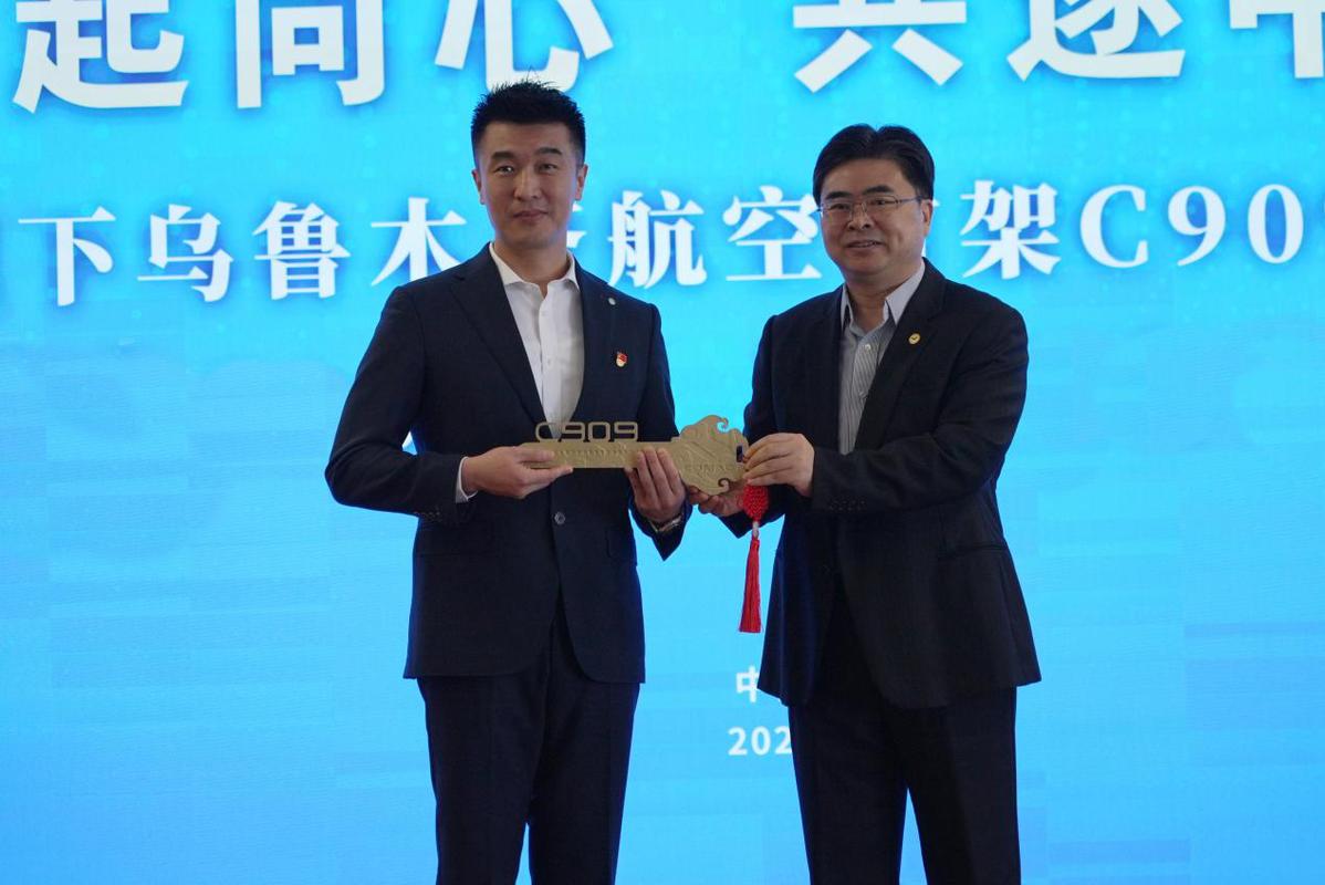 仪式于上午10时正式开始,中国商飞向乌鲁木齐航空正式移交象征飞机交付的纪念钥匙,民航华东地区管理局向乌鲁木齐航空颁发《单机适航证》《国籍登记证》及《无线电台执照》,标志着首架C909飞机正式入列乌鲁木齐航空机队。