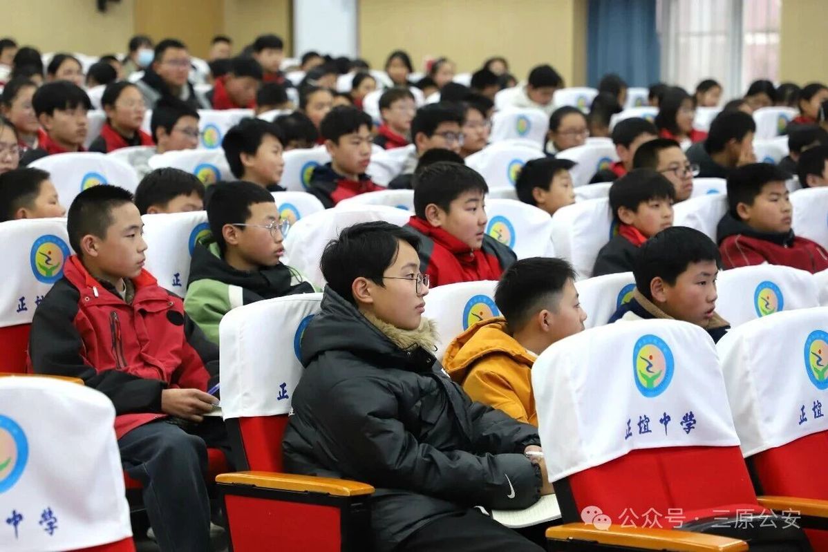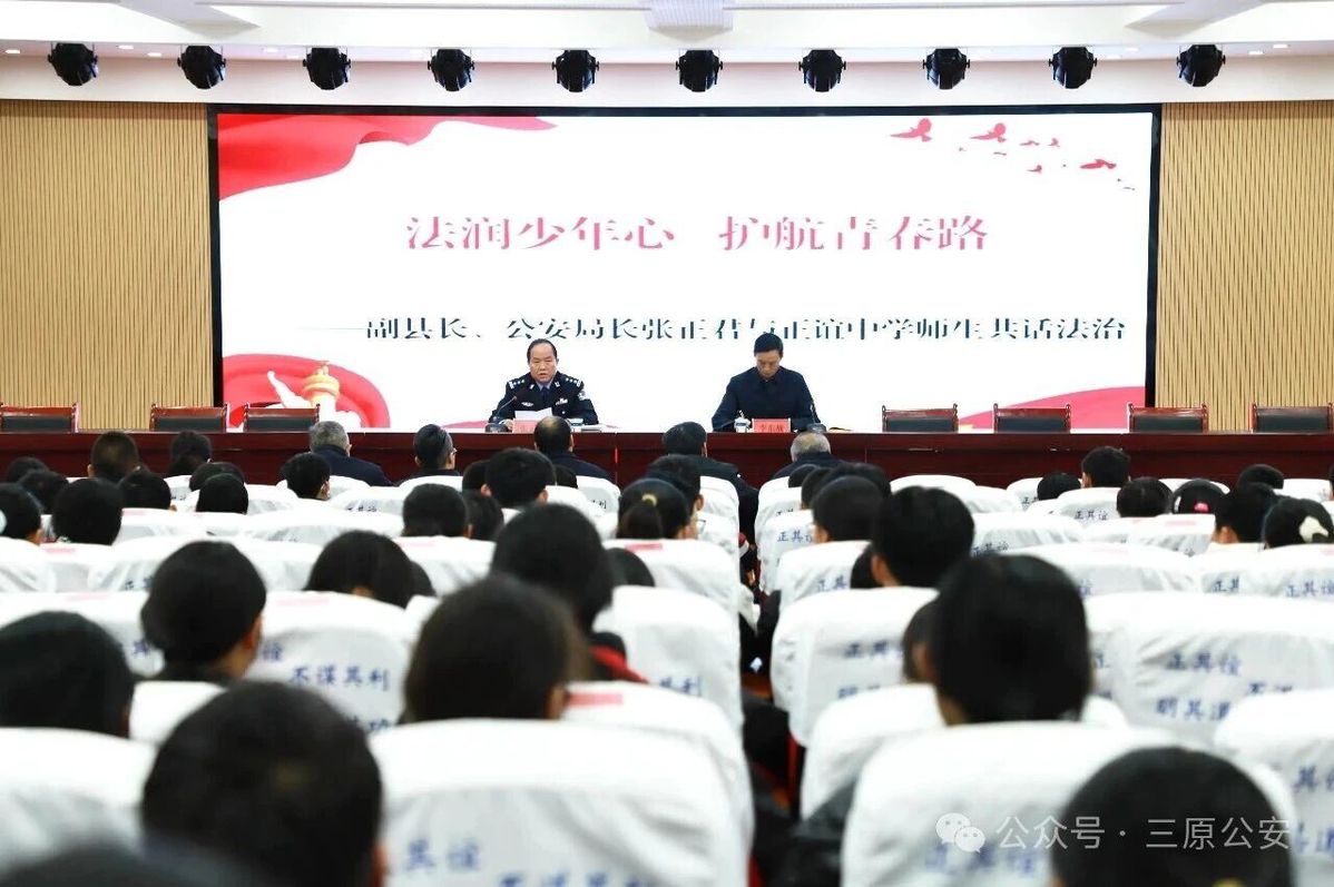 为深入推进 “金盾护苗” 专项工作,落实 “六个一” 工作要求,12月12日,陕西三原县副县长、县公安局党委书记、局长张正君走进正谊中学,开展 “法润少年心 护航青春路” 主题法治宣讲活动,面对面为师生普及法律知识,以法治力量筑牢青少年健康成长安全防线。活动由县教育局局长李东战主持。