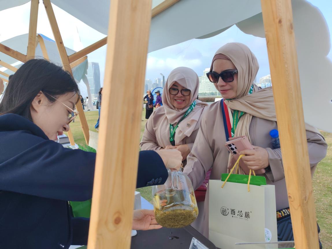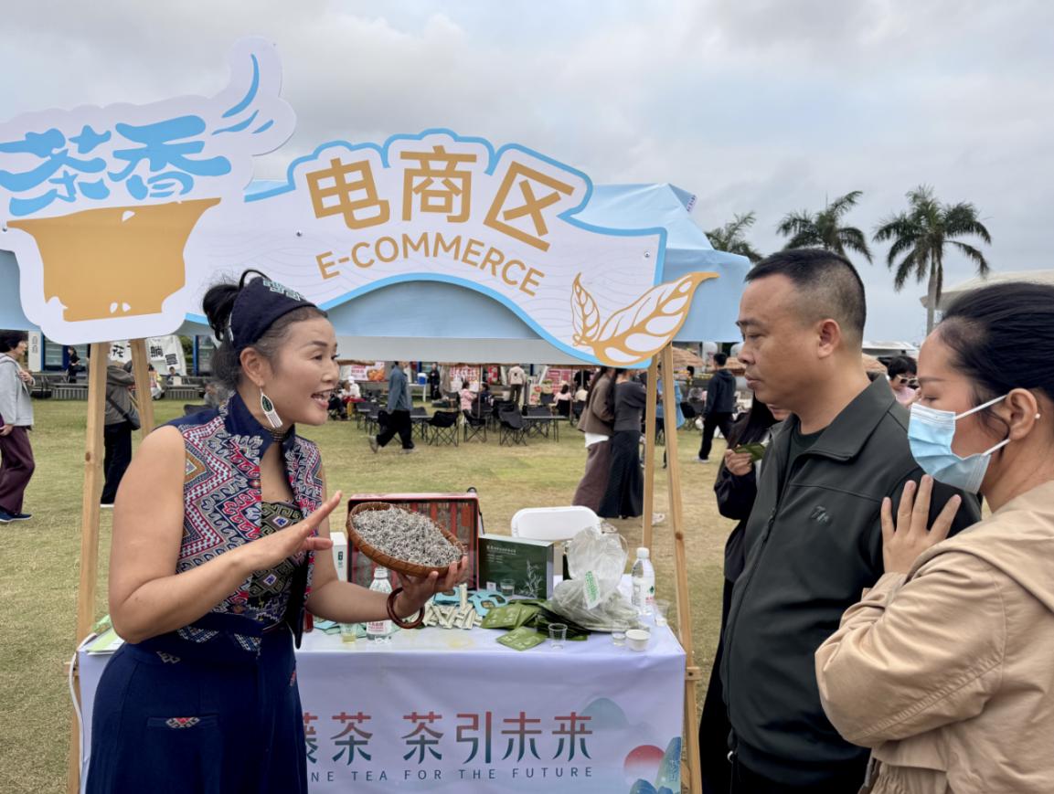 (湖北酉凤来硒生态农业科技有限公司杨艺琼向海口市民游客展示小藤匠来凤藤茶)