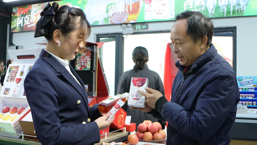 店内,红彤彤的阿克苏冰糖心苹果及苹果汁、苹果干、苹果酒等深加工产品突出展示,虎皮枣、纸皮核桃、枣仁蒸切糕等特色农产品整齐陈列,吸引了众多市民游客咨询选购。顾客赵翔说:“今天特意来逛新店,这里有阿克苏本地的正宗冰糖心苹果,还有特色牛羊肉产品,品质很好,这个场所让我们方便为家人朋友选购特色产品。”