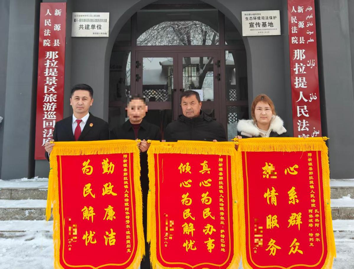 图为新源县人民法院那拉提人民法庭案件承办法官、人民调解员及书记员接收锦旗画面。