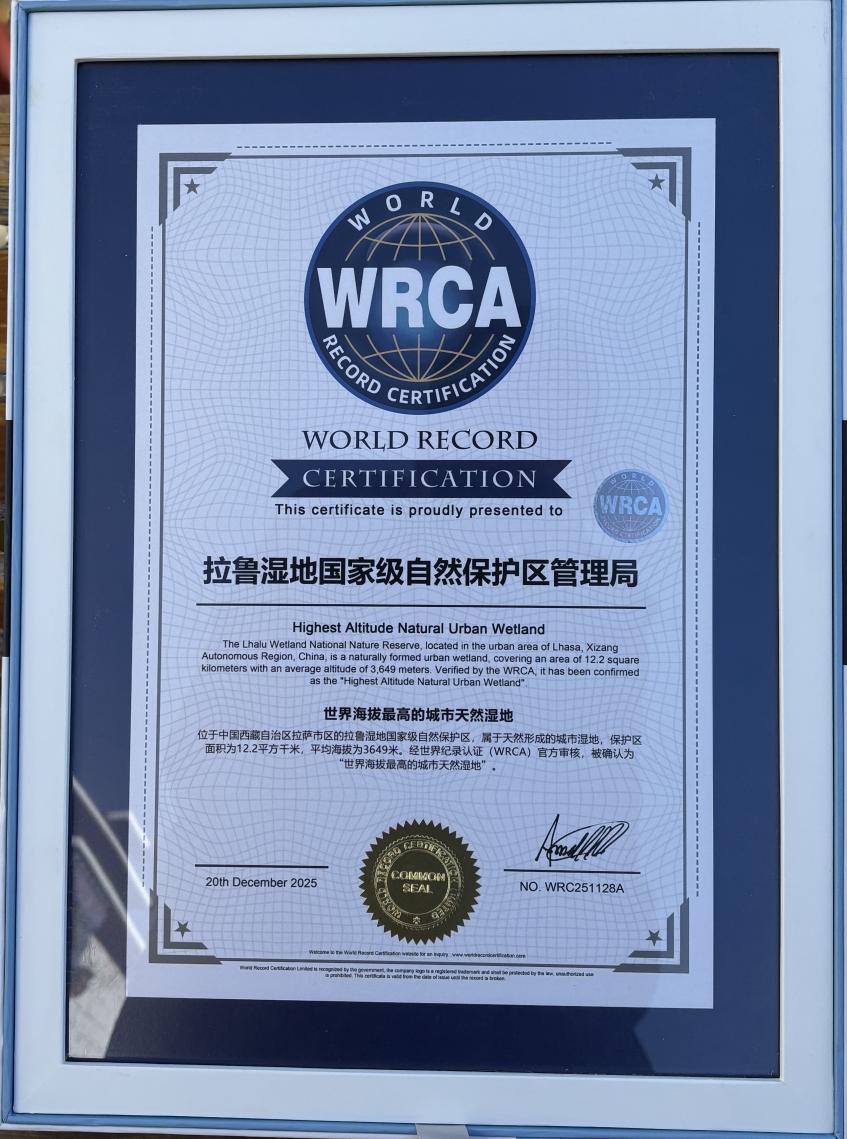 12月20日,被誉为“拉萨之肺”的拉鲁湿地国家级自然保护区正式通过WRCA(世界纪录认证机构)认证,摘得“世界海拔最高的城市天然湿地”世界纪录称号,向全球展现了中国高原湿地保护的卓越成效。