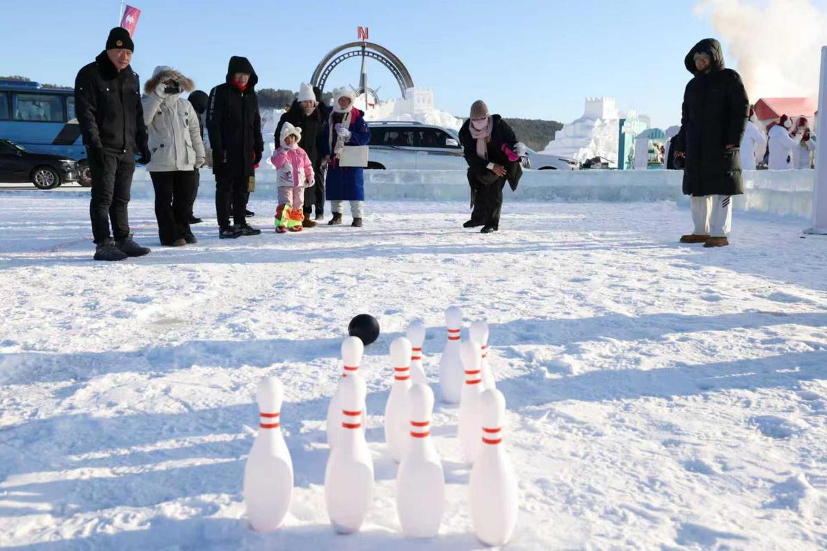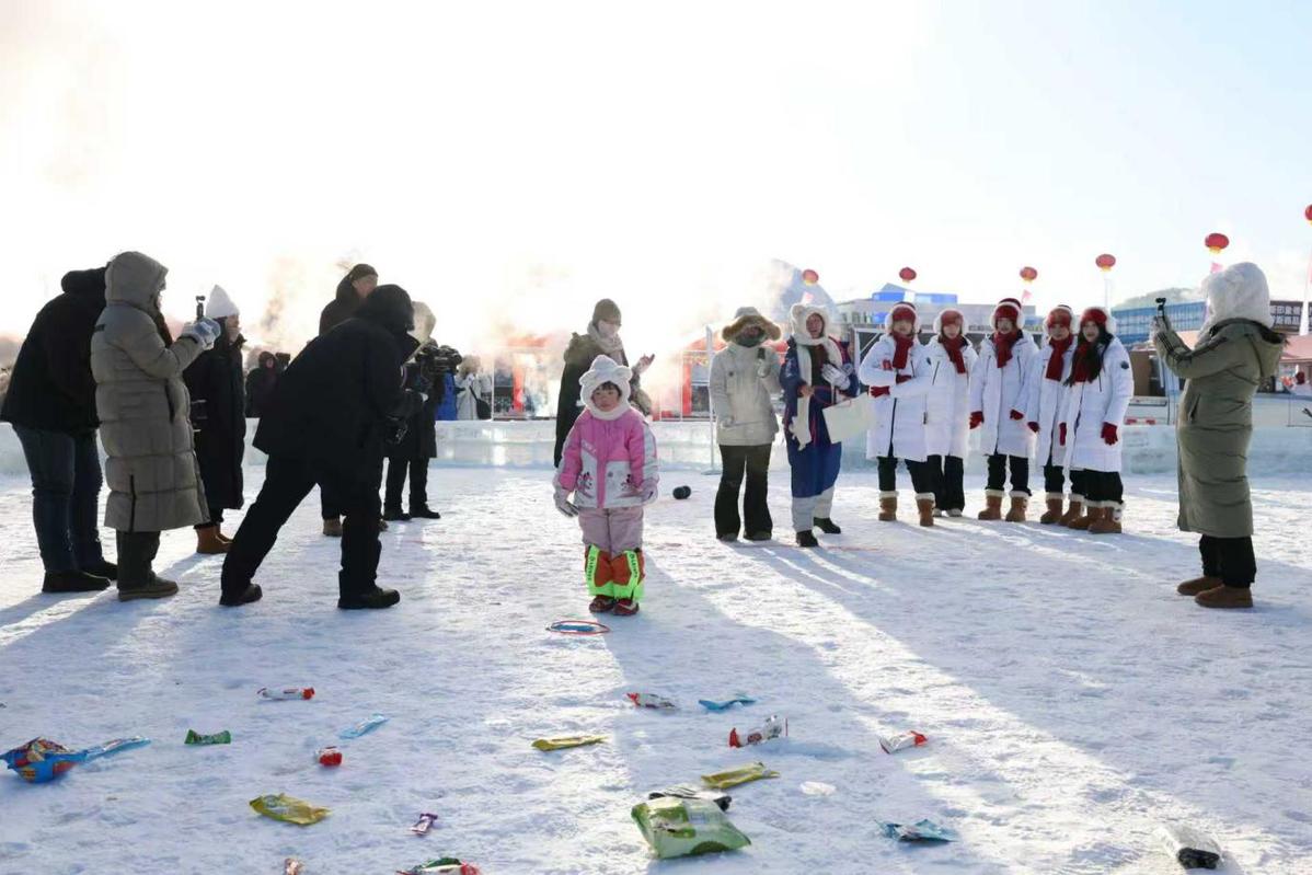 趣味赛设置冰面滚雪球、雪地拔河、冰上保龄球、冰上滚铁环、雪山找宝、雪地套圈等特色项目,既深度挖掘了漠河冰雪资源优势,彰显了北极冰雪魅力,又融入了大众喜闻乐见的趣味运动元素,实现了“冰雪+体育+旅游”的完美融合。赛场上,参赛者们在冰雪项目中感受传统民俗的独特魅力,在欢声笑语中凝聚冬日温情。极寒天气也丝毫未阻挡现场观众的热情,欢呼声、呐喊声持续在七星广场上回荡。“特别好玩,就是我小时候从没有体验过的感受,就是可以推雪球儿,还有冰圈,都是小时候没体验过的。”广东游客关关说。