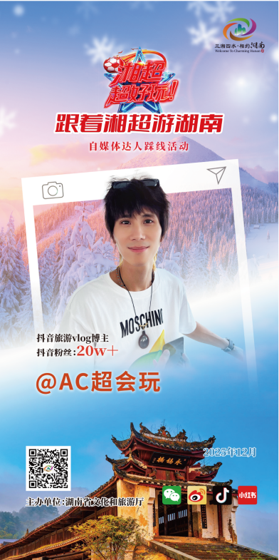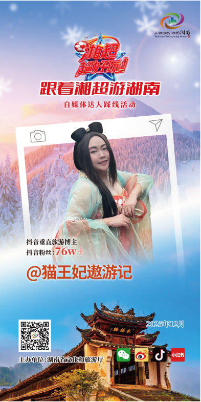 中国日报12月21日长沙讯 冬日潇湘,激情涌动。12月20日至21日,恰逢2025“湘超联赛”半决赛激战正酣,以“湘超引流+冬季赏景”为核心的“湘超,超好玩·跟着湘超游湖南”网红达人采风活动在长沙正式启动。本次活动由湖南省文化和旅游厅主办,旨在依托湘超联赛IP影响力与网红达人流量传播力,深度推广湖南冬季文旅产品,推动“赛事+旅游”融合发展,为冬季文旅市场注入全新活力。
