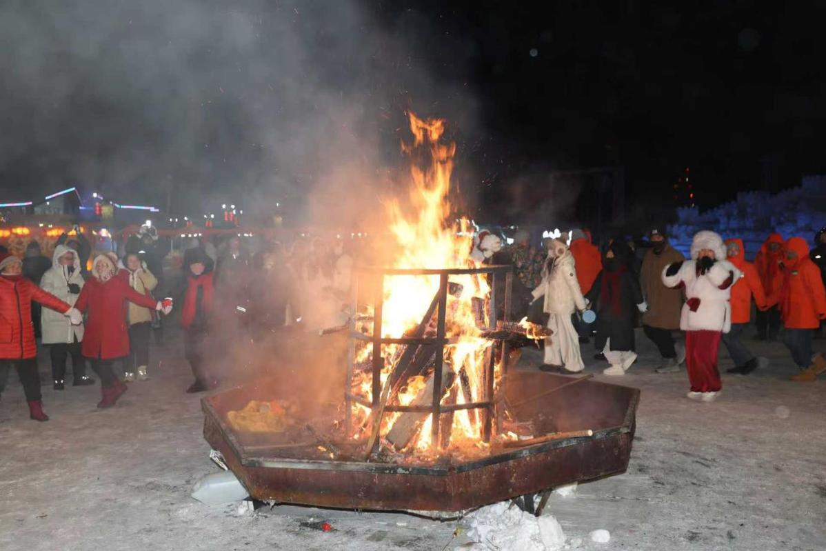夜幕降临,篝火熊熊燃起,绚烂的烟花在七星广场江面上空绽放,现场欢呼声四起,居民和游客围着篝火载歌载舞,在极寒夜色中感受“冰火两重天”的独特体验。“虽然天气很冷,但玩的特别开心,越跳越嗨,在篝火旁跳的全身都热起来了。”辽宁游客付女士说。