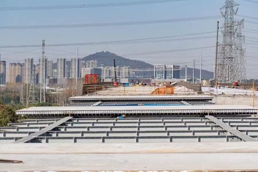 面对无成熟经验可循的挑战,项目团队攻关多项核心技术,以毫米级精度把控质量。构件制作中,研发专用工装与加工工艺,解决L型预埋件焊接变形难题,实现了毫米级精度的管控;钢主梁工厂制作尺寸合格率达100%,节段拼装直线度偏差≤3mm,孔群对位偏差≤1mm。现场施工采用主梁快速拼装、高精度叠合等技术,单个节段拼装仅需2天,短尾环槽高强拉铆钉安装几十秒即可完成,且适应-40℃至80℃宽温度范围,不仅提升了连接质量与抗振动、防松动性能,更显著提高了生产效率。