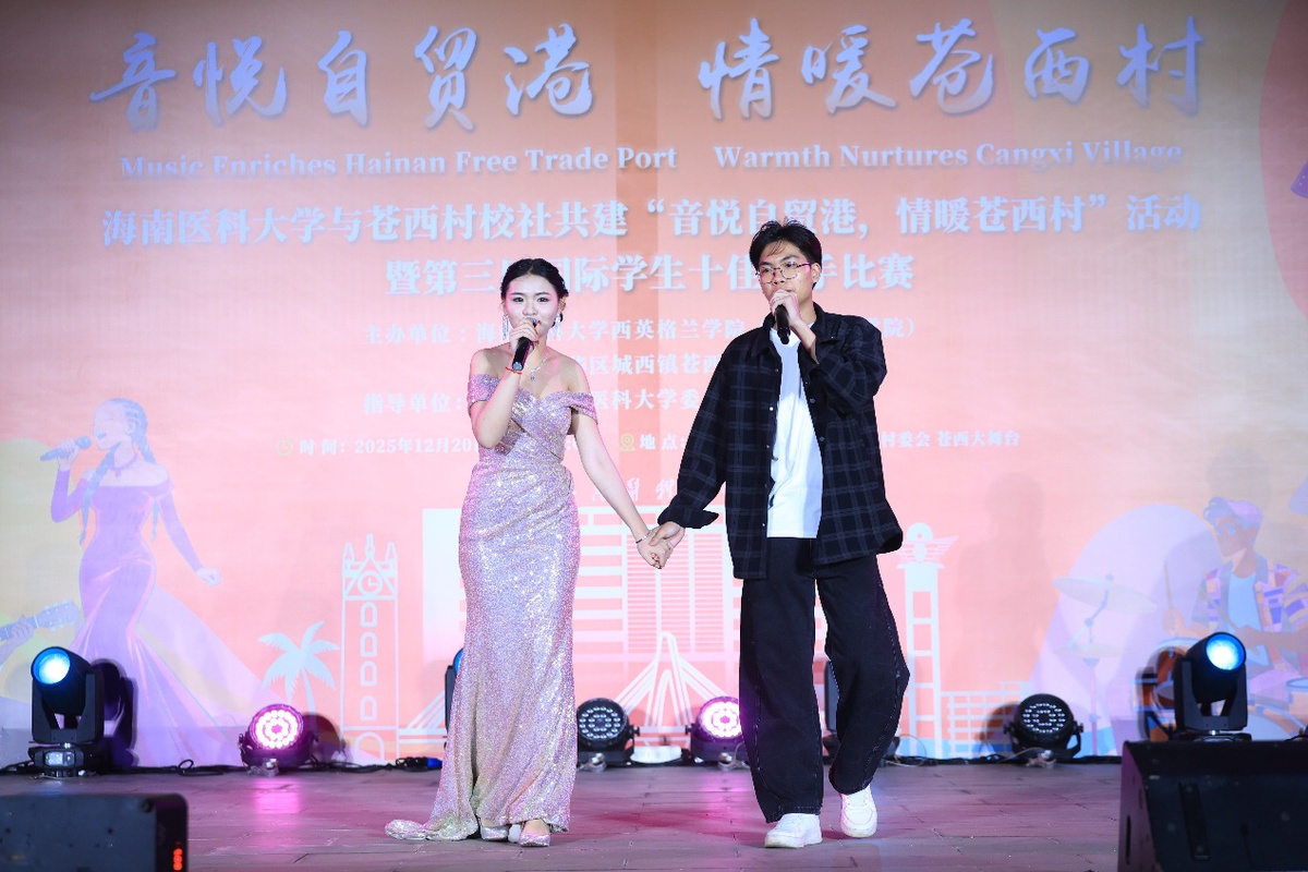 12月20日,由海南医科大学西英格兰学院(国际教育学院)与海口市龙华区城西镇苍西村村委会联合主办的校社共建“音悦自贸港,情暖苍西村”活动暨海南医科大学第三届国际学生十佳歌手比赛,在海口市龙华区城西镇苍西村委会社区活动场地圆满落幕。