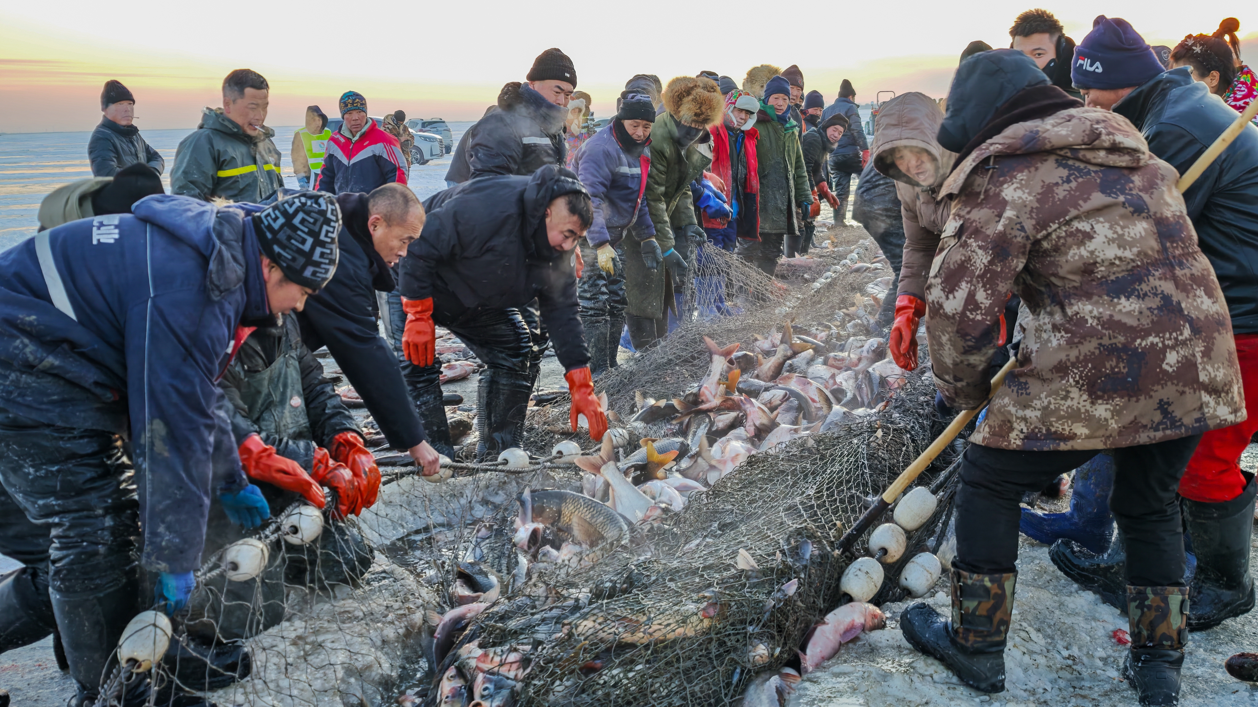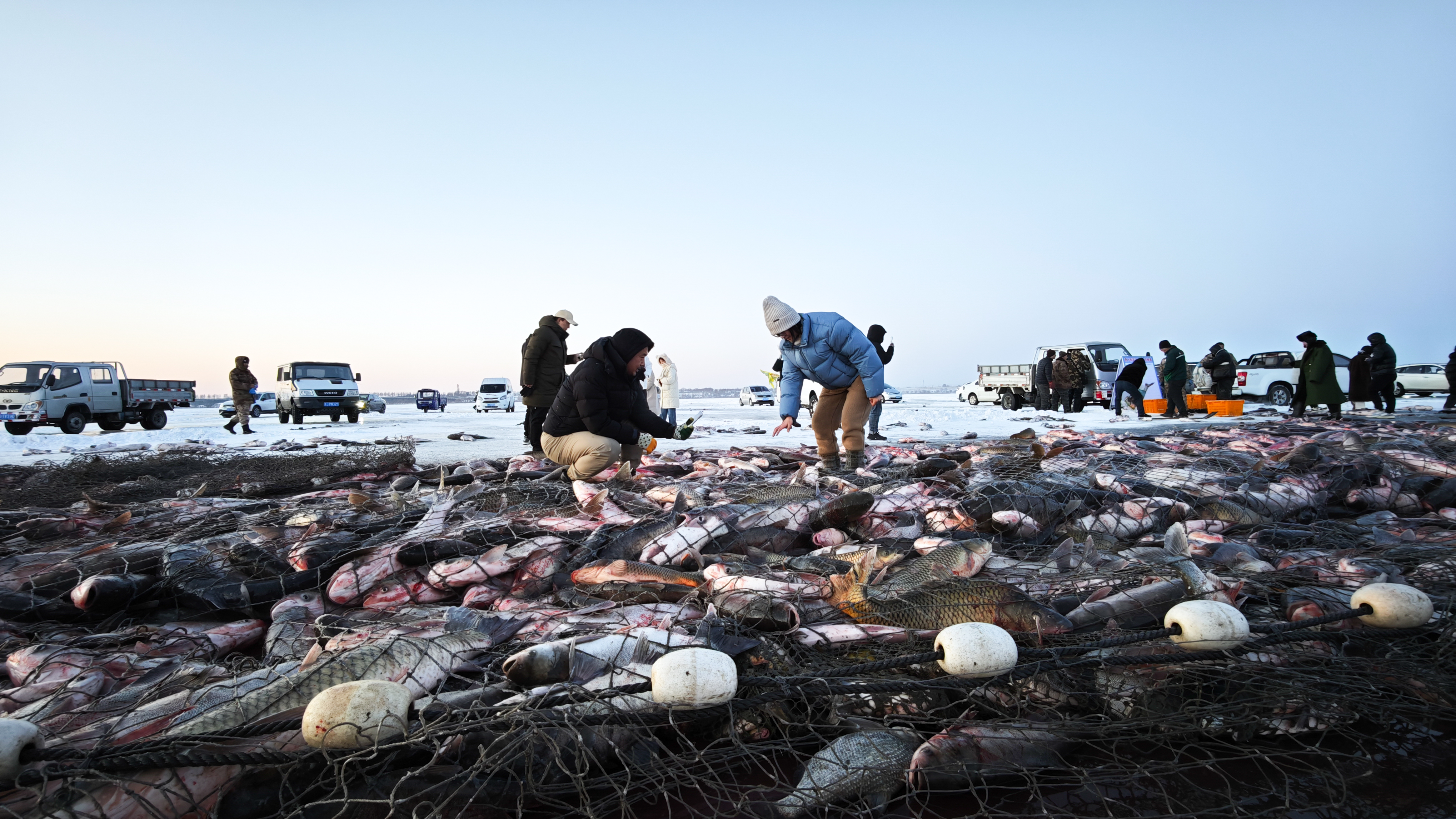 冬捕现场,串杆、走网、马拉绞盘……这些沿袭千年的古老作业方式,引得游客们纷纷驻足拍照留念。下午3时许,数万尾肥硕鲜活的查干湖鲜鱼,随着巨网从冰面之下缓缓被拖出。这震撼人心的一幕,瞬间点燃了全场的热情,游客们的欢呼声此起彼伏。