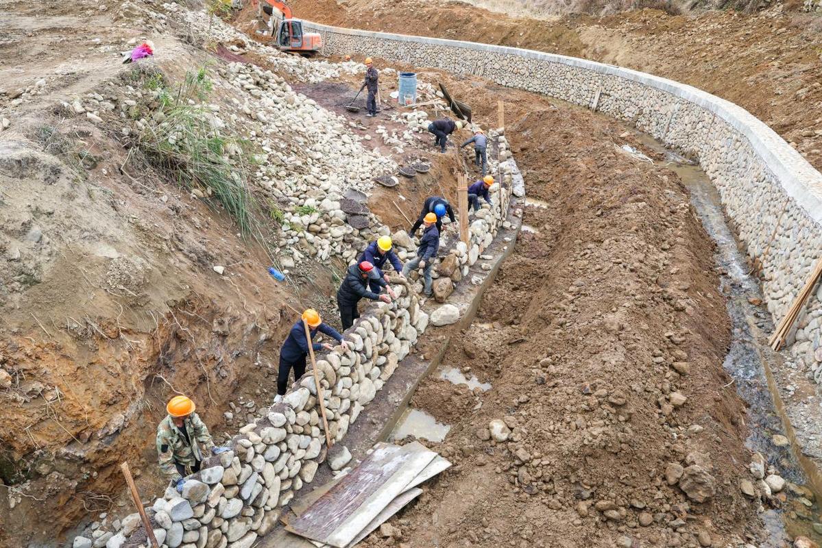 1月5日,施工人员与上梅乡河长办工作人员在武夷山市上梅乡翁屯村河道护岸工程施工。(邱汝泉 摄)