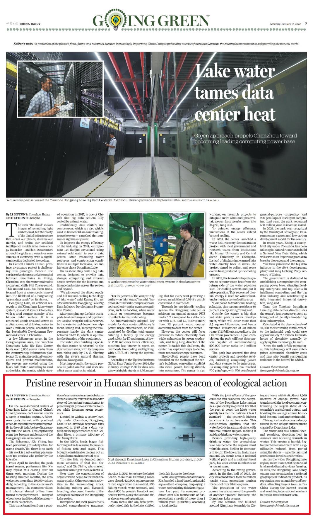 编者按:2026年1月12日,《中国日报》第七版“绿色中国”专栏推出湖南郴州盘活水资源,实现绿色转型发展的整版报道。副稿Pristine reservoir in Hunan shimmers as beacon of ecological action,讲述郴州践行“绿水青山就是金山银山”理念,通过环境整治和产业调整,使东江湖恢复自然生态,发展绿色农业,转型生态旅游,实现可持续发展的故事。报道同步在《中国日报》国际版刊出。