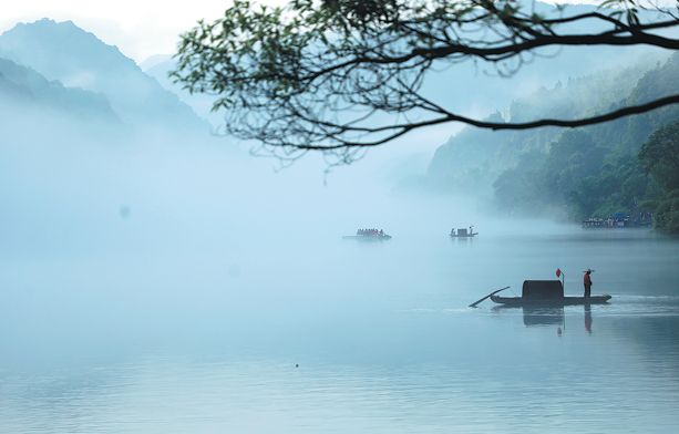黎明时分,东江湖晨雾弥漫,如诗如画。渔民娴熟地将渔网撒出,在空中划出一道美丽的弧线后,渔网没入水中。这一幕灵动的美景已成为东江湖景区的标志性画面。