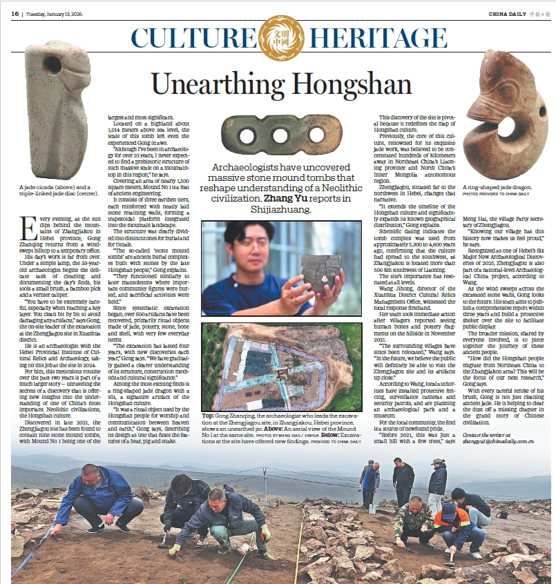 中国日报网1月16日电(记者 张余) 2026年1月13日,《中国日报》第16版“文明中国”栏目刊发深度报道《Unearthing Hongshan》。文章通过河北宣化郑家沟遗址考古记,揭示了红山文化新篇章。
