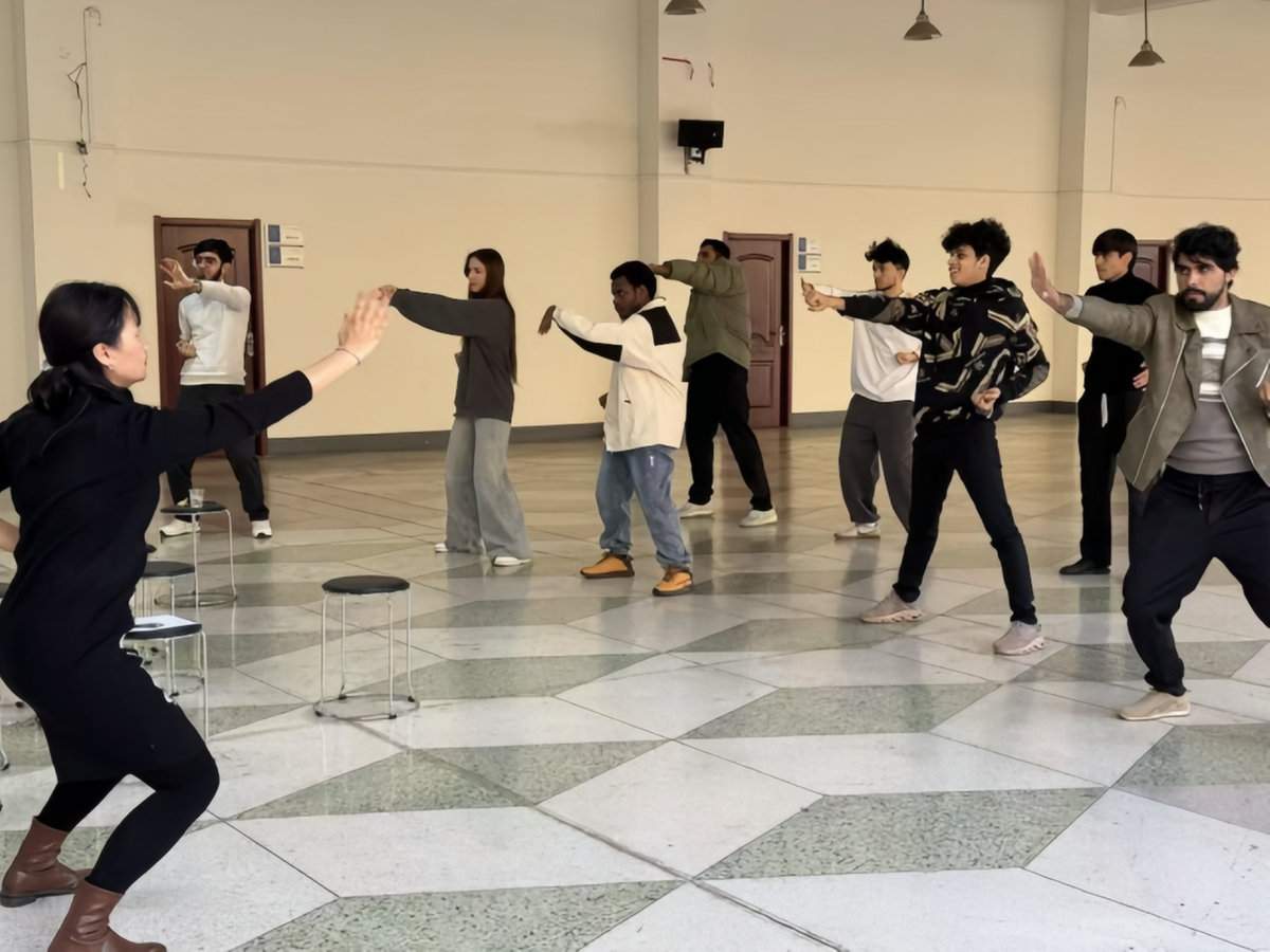 西安石油大学教师带领留学生练习八段锦