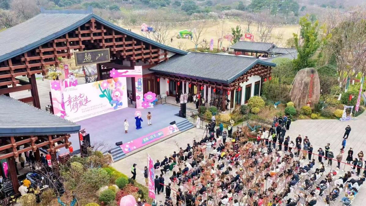 开幕式上,景区正式发布官方文创IP“喜七七”。该形象源于超山特有六瓣梅,融合古典梅韵与柔美设计,承载地域文化基因,未来将作为超山古镇大景区文化标识,助力品牌塑造与人文传播。活动现场同步成立上海市吴昌硕文化艺术基金会文化超山专项基金,创新采用“基金会+景区+公益+大学生创业团队”模式,依托吴昌硕与超山的历史渊源,支持青年创意转化,推动艺术精神传承与公益实践结合,着力打造长三角文化公益助推青年创业的示范案例。