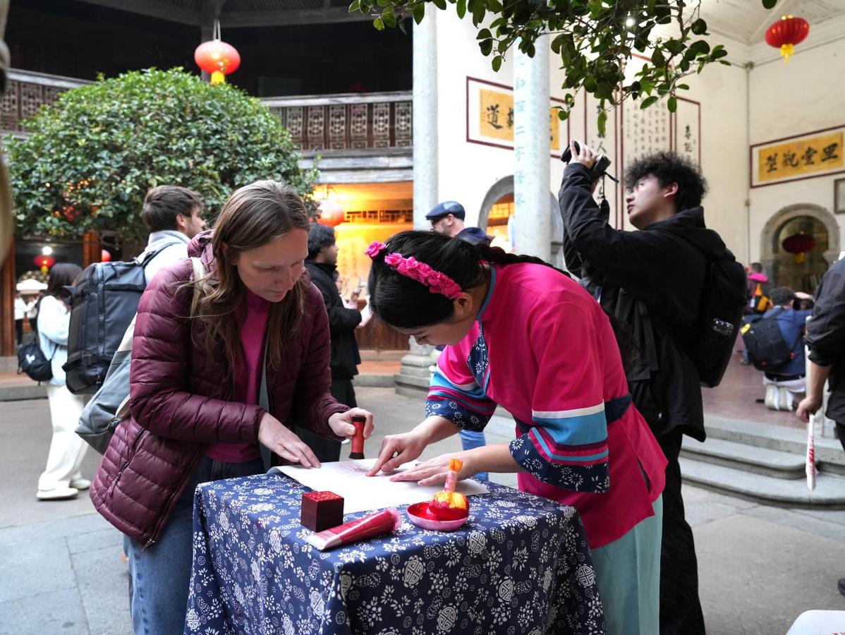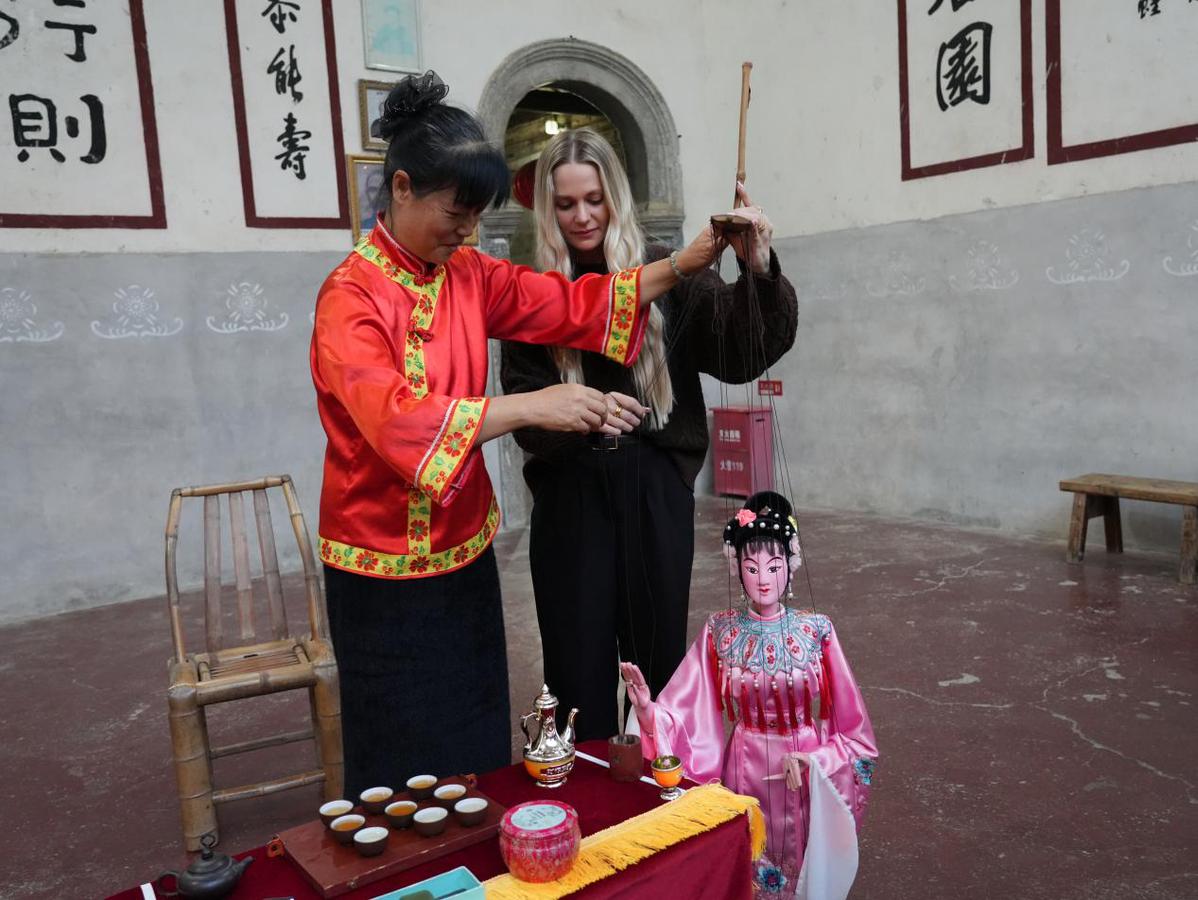 期间,网红大V还体验了客家小吃打糍粑、镬笃粄的制作过程,在烟火气中感受客家饮食文化,品尝地道的客家美食。同时,大V们观赏拓“福”、客家蓝衫非遗展示,近距离触摸客家文化的鲜活脉络。在客家艺人的悉心指导下,德国网红Sindy学习并尝试了木偶泡茶的技艺,吸引同行的其他大V驻足拍摄了这一生动有趣的互动场面。