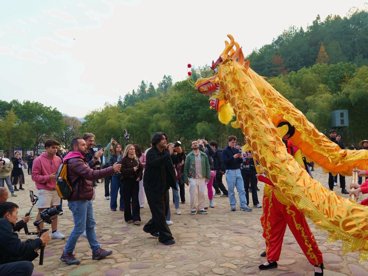 振成楼前,“金龙”舞动,欧洲网红大V争相记录。(供图)