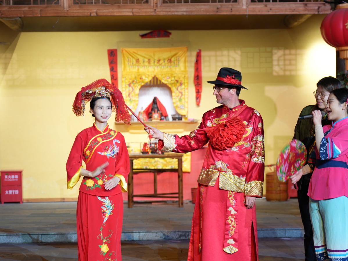 欧洲网红大V在沉浸式体验客家中式婚礼。(供图)