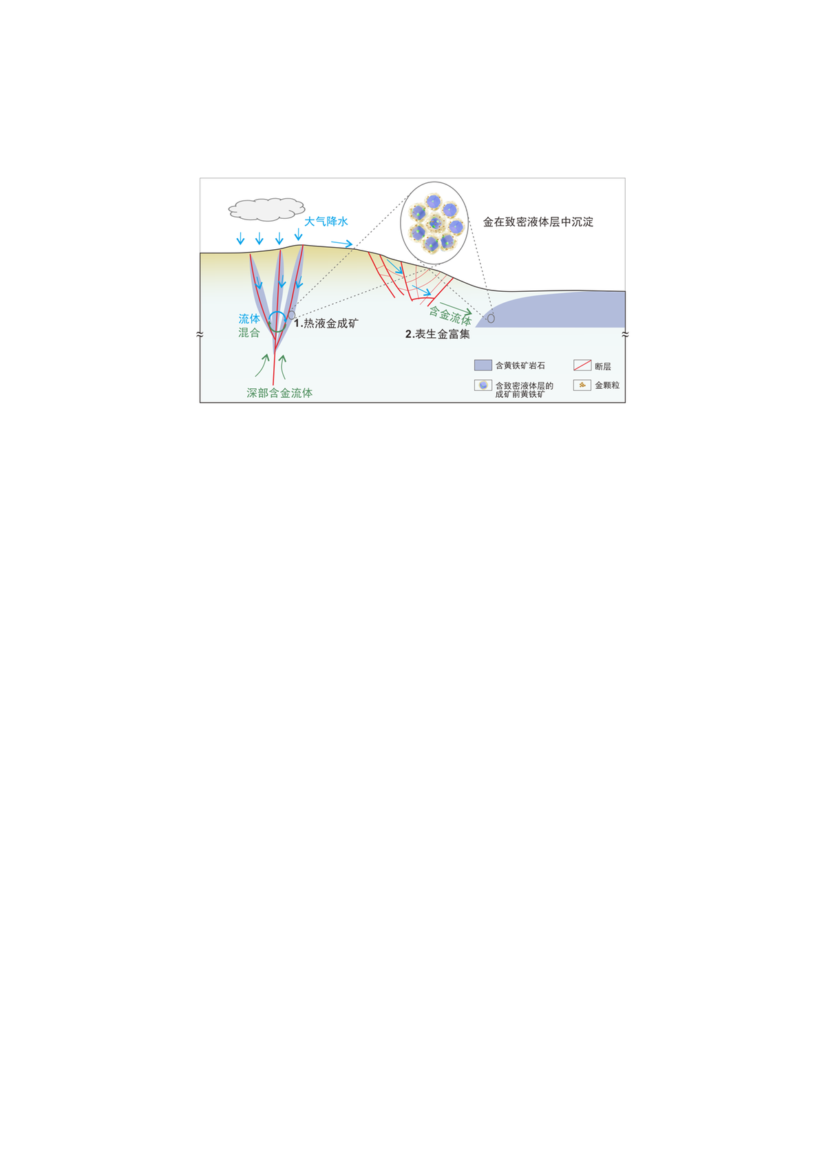 该机制同时适用于热液型金矿床(如造山型、卡林型及浅成低温热液型)和表生金富集过程(图2)。在热液型金矿床中,热液流体与大气降水混合可形成氧化的含金流体,它们与成矿前黄铁矿相互作用后可导致金沉淀。在表生过程中,天然水可淋滤并富集形成低浓度(ppb级)含金流体,同样在与黄铁矿反应时触发金沉淀。