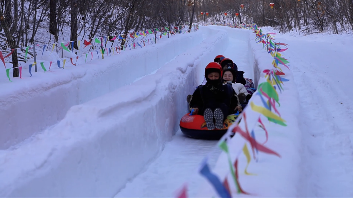 多国游客一同体验“超长冰雪滑梯”