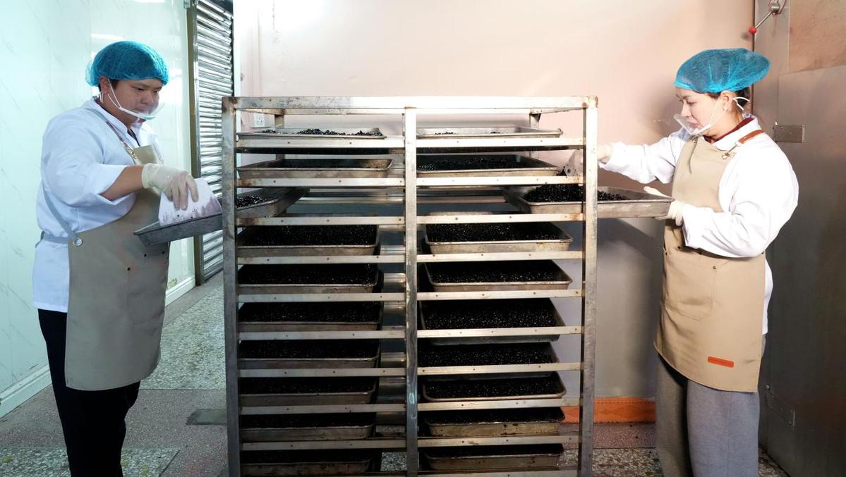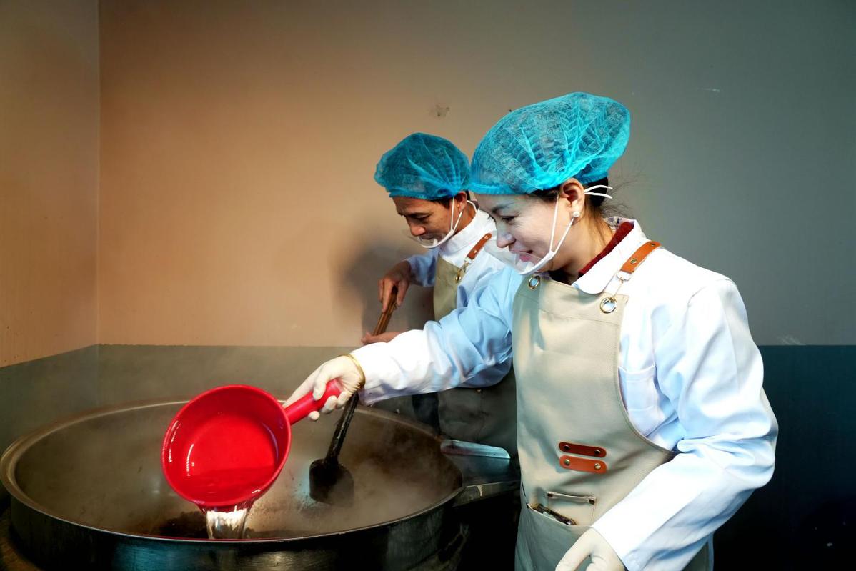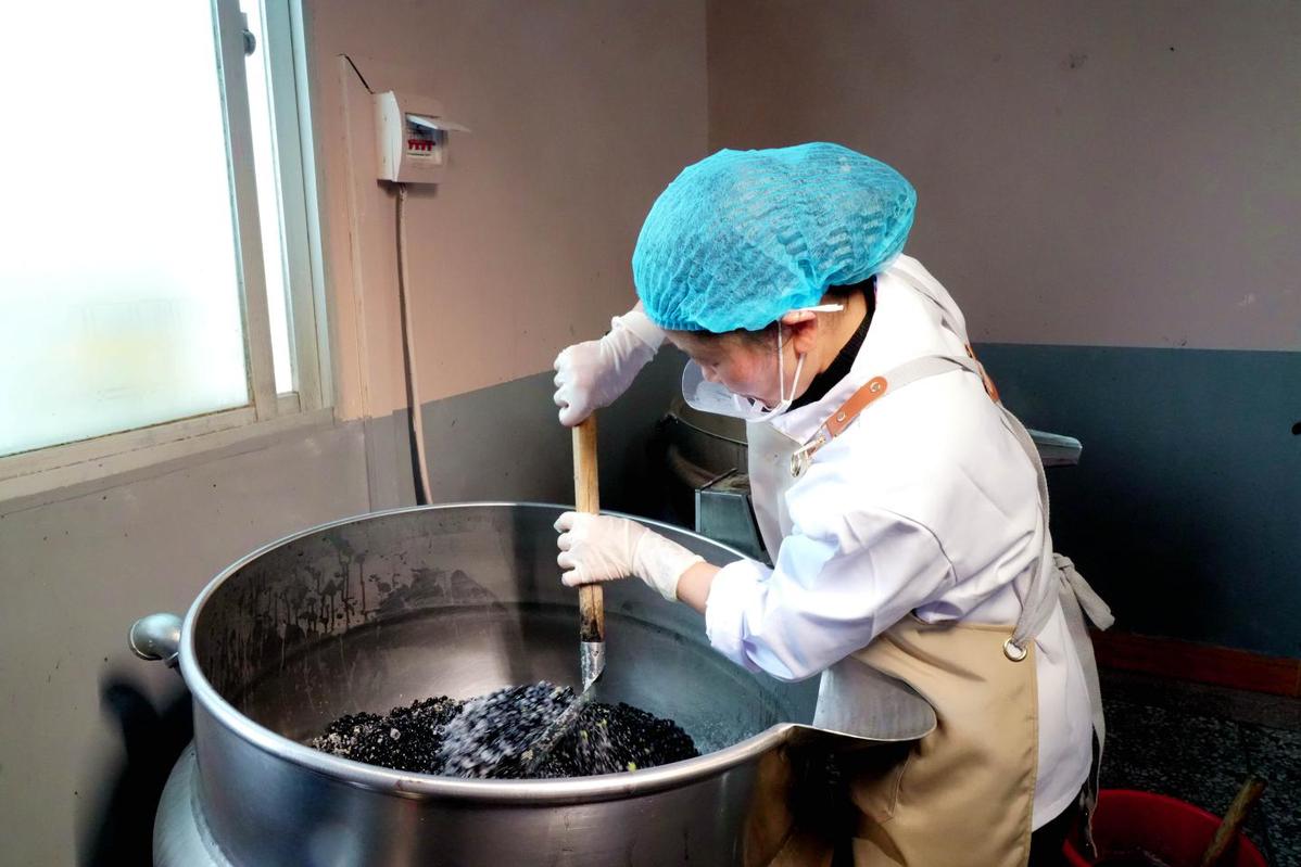 蒸盘上热气蒸腾,村民快速翻炒黑豆,粒粒分离不粘连,确保每颗都干爽劲道,守住古法风味。(供图)