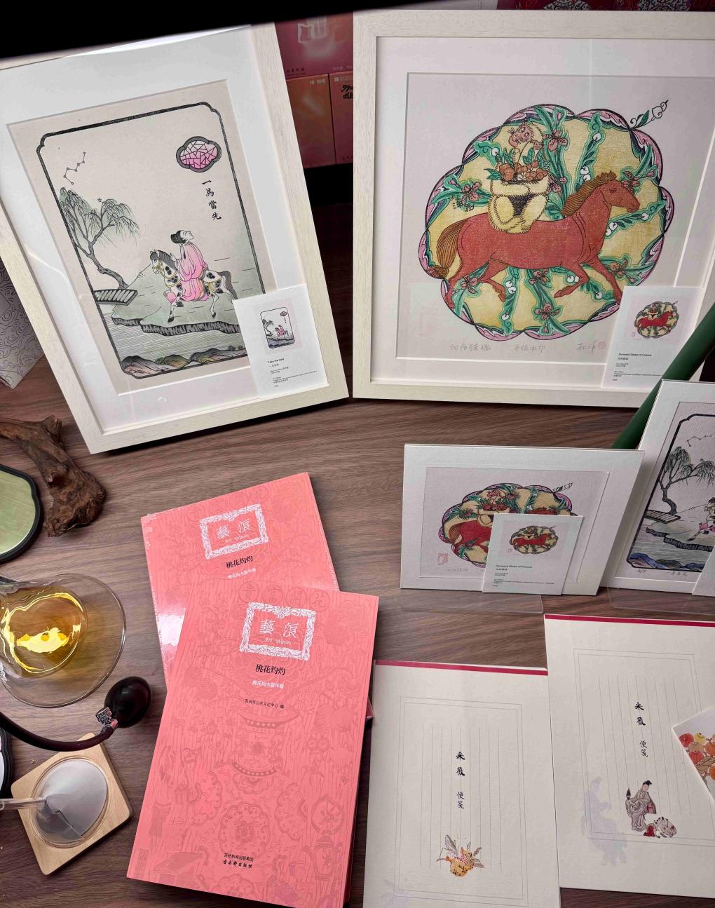 为让传统文化走进现代生活,苏州市公共文化中心研发推出了四大类文创产品,将桃花坞木版年画的传统寓意与现代设计相结合,打造兼具文化感与实用性的生活好物。其中,“花开富贵”香氛系列含三款香薰蜡烛、两款无火香薰及套装礼盒,灵感源自《花开富贵》《莲菱满盆图》等经典年画,以江南韵味香型传递吉祥祝愿,营造雅致家居氛围。“桃花灼灼”织品系列萃取丁亮先《石榴花上的鸟儿》《枇杷上的蝴蝶》等作品元素,推出真丝方巾、丝绸礼盒等多款单品,以苏州丝绸为载体,实现桃花坞木版年画与苏州丝绸两大非遗的跨界融合,让传统美学可戴可携。“采薇人”纸品系列则围绕年画原始载体“纸张”,开发可撕月历册、笔记本、信笺等文具,将年画中的吉祥寓意融入日常书写、阅读与时间规划,兼具实用价值与文化质感。实用生活系列提取传统门神、《招财进宝》等年画的经典形象与寓意,采用环保铝材打造冰箱贴、行李牌等产品,以非遗祝福点缀生活细节。
