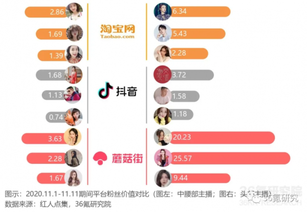 据36氪研究院《2020年中国直播电商行业研究报告》中的一组数据,在将粉丝价值按照单场GMV/粉丝数量计算,对比2020年11.1-11.11期间淘宝、抖音、蘑菇街三类平台的粉丝价值后,发现以最高值计算,1个蘑菇街粉丝的价值=6.9个抖音粉丝=4个淘宝直播粉丝。