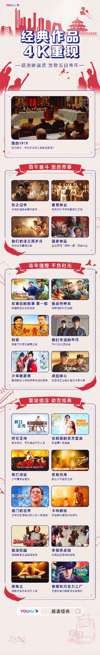 今年是中国共青团成立100周年,在五四青年节前夕,优酷又以4K标准修复了一批经典电影和剧集,致敬百年间为理想不懈奋斗的青年们。