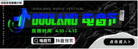 “DouLand电音节”专场活动是抖音全民直播计划全新推出的音乐垂类子板块,于4月10日至4月13日期间,在抖音直播平台开辟“DouLand电音节”专区。活动整体以线上音乐节形式,每日分为电音节文化主题活动及电音演出舞台2个模块展开。除高品质的全球顶尖DJAlan walker和小马丁Martin Garrix直播以外,也融入更多跟电音文化相关的娱乐内容,为期4天的直播活动将分别围绕4个主题进行分享。首日“DouLand博物馆”在线展开电子音乐小课堂,以生动趣味方式硬核科普音乐知识、电音历史及代表人物;次日“DouLand潮天地”分享电音节的潮流穿搭,盘点最in的穿搭指南,教你足不出户学会电音节吸睛大法。接下来两天还有“DouLand美食铺”分享电音节的美食教程,以及“DouLand创意园”,开展过往的电音节宿营记录、出游攻略、妆容教程大起底。