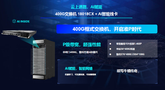 AI赋能:极简XS智能网络利用AI智能线卡将AI能力嵌入网络之中,提供了本地训练与云端结合的融合计算,为机器学习提供了更加灵活多用的训练模式。它同时更是一台“超级AI发动机”,不仅提供了5.4T背板带宽、单端口400G、带宽最高1.468P的接入能力,其浮点运算能力更达到了130TFlops,AI性能超越行业平均水平的10倍以上,足以应对最复杂的网络业务需求。