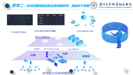 在经验分享环节,厦门大学附属翔安医院信息中心李振叶主任带来了《后疫情时代下的医院信息化建设与思考》精彩演讲,结合教育行业、医疗行业的数据中心安全、物联网在医疗一线的具体应用,已经疫情期间“火神山”医院信息系统建设的具体情况进行了全面介绍。她提出的“部署智能网络,实现业务即插即用,网络永不调整”的思路,在数千名线上参会嘉宾中引起了广泛共鸣。