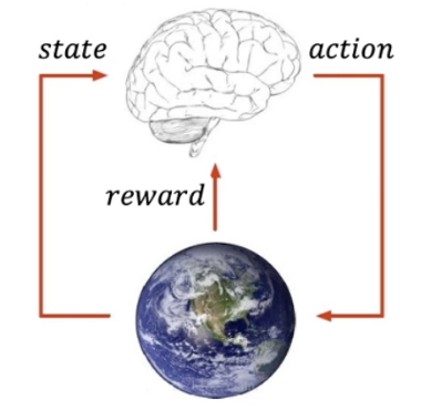 在强化学习中,算法被称为智能体Agent,Agent从环境中获取状态(state),并决定自己要做出的动作(action),环境会根据自身的逻辑给Agent予以奖励(reward),奖励有正向和反向之分。比如在游戏中,击中一个敌人就是正向的奖励,而掉血或者游戏结束就是反向的奖励,强化学习会根据试错带来的结果,为下一步的动作做出决策。其设计灵感源于心理学中的行为主义理论:有机体如何在环境给予的奖励或惩罚刺激下,逐步形成对刺激的预期,从而产生能获得最大利益的习惯性行为——而这也是人类的自然学习路径。